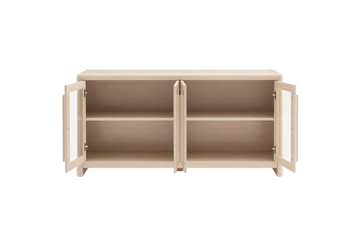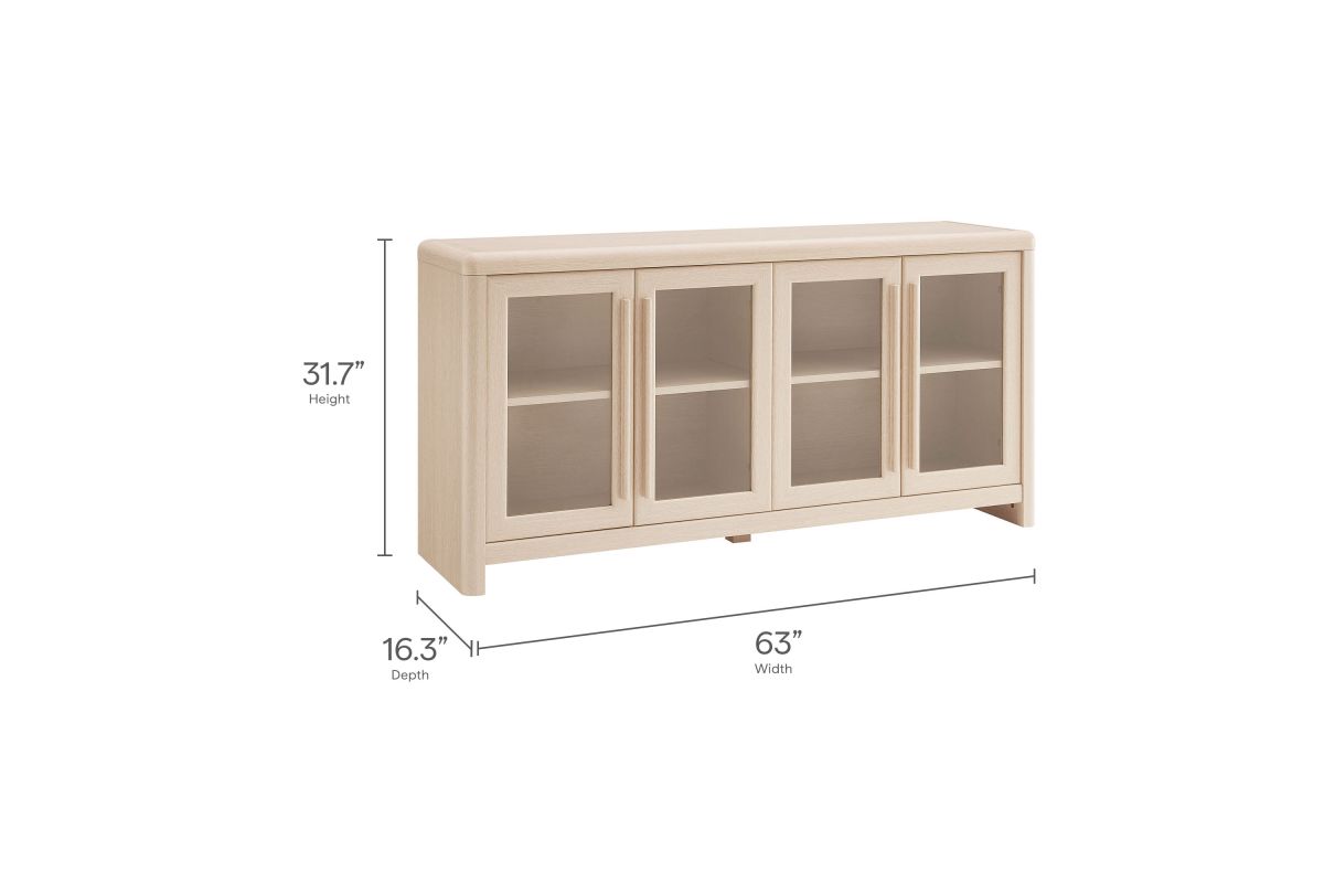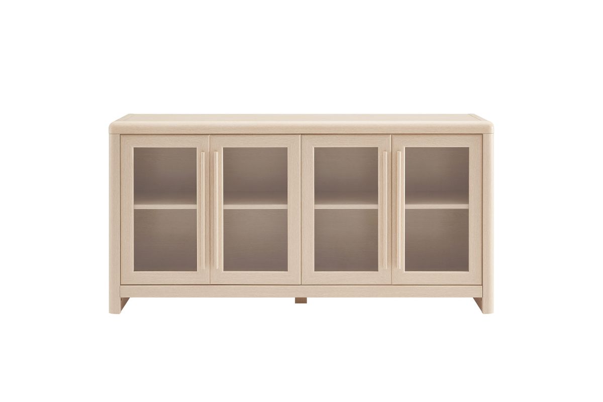 The Evren Sideboard Cabinet blends modern farmhouse charm with versatile functionality, making it a refined centerpiece for any space. Crafted with sturdy construction and a beautiful wood grain laminate, this buffet sideboard cabinet features four glass-paneled doors that add an elegant, airy feel while showcasing interior storage. The elongated vertical handles provide a sleek, contemporary touch, complementing the streamlined silhouette. Designed for flexible storage, the adjustable shelves offer ample space for dinnerware, bar essentials, or displaying your favorite items, while cable management holes with covers ensure effortless organization of electronics when used as an entertainment console. Soft-close hinges allow for smooth operation, and non-marking floor glides protect surfaces from scratches. Perfect for use as a dining room buffet, liquor cabinet bar for home, TV stand, or hallway storage cabinet, the Evren Sideboard is a sophisticated and practical addition to any living space. Assembly required.