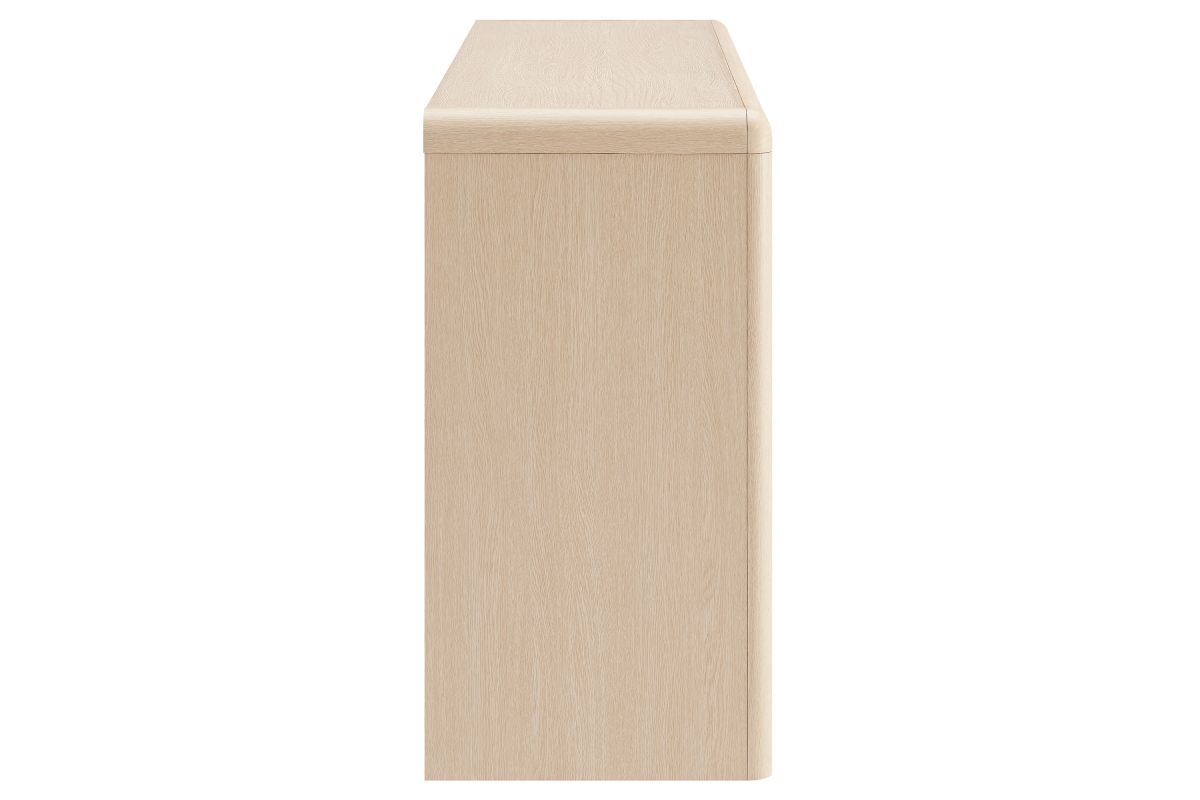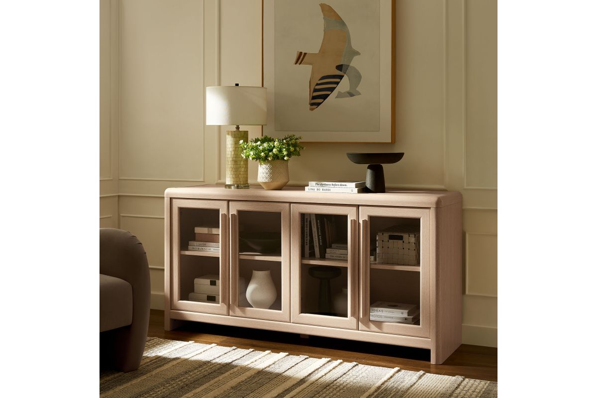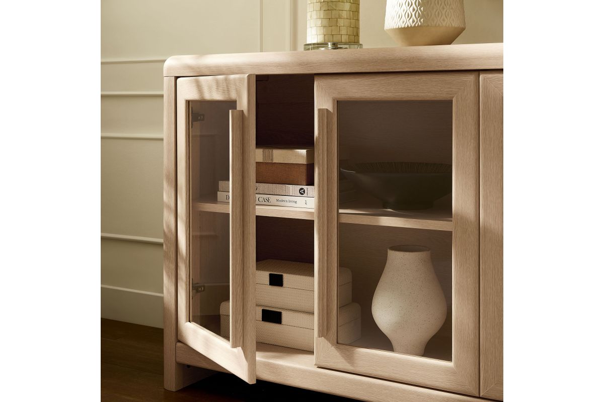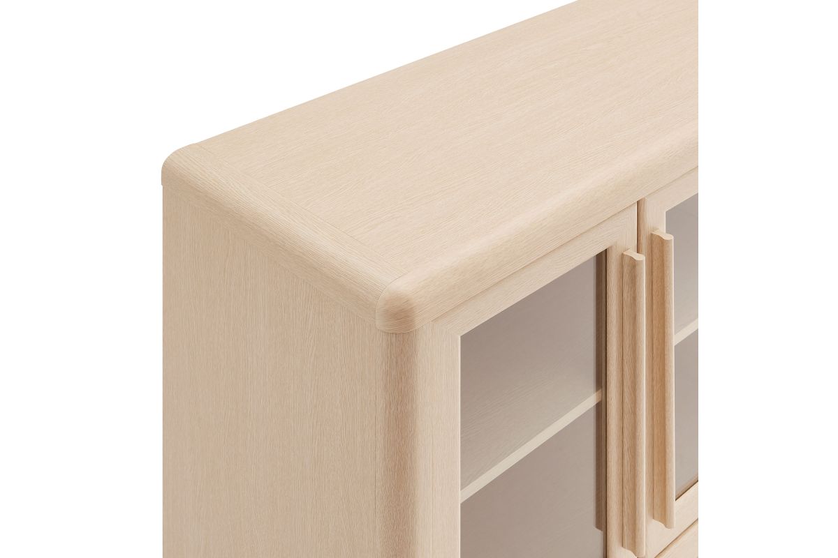 The Evren Sideboard Cabinet blends modern farmhouse charm with versatile functionality, making it a refined centerpiece for any space. Crafted with sturdy construction and a beautiful wood grain laminate, this buffet sideboard cabinet features four glass-paneled doors that add an elegant, airy feel while showcasing interior storage. The elongated vertical handles provide a sleek, contemporary touch, complementing the streamlined silhouette. Designed for flexible storage, the adjustable shelves offer ample space for dinnerware, bar essentials, or displaying your favorite items, while cable management holes with covers ensure effortless organization of electronics when used as an entertainment console. Soft-close hinges allow for smooth operation, and non-marking floor glides protect surfaces from scratches. Perfect for use as a dining room buffet, liquor cabinet bar for home, TV stand, or hallway storage cabinet, the Evren Sideboard is a sophisticated and practical addition to any living space. Assembly required.