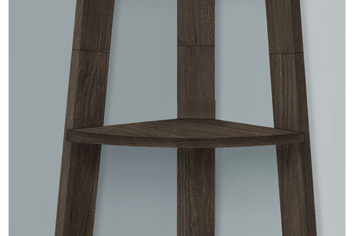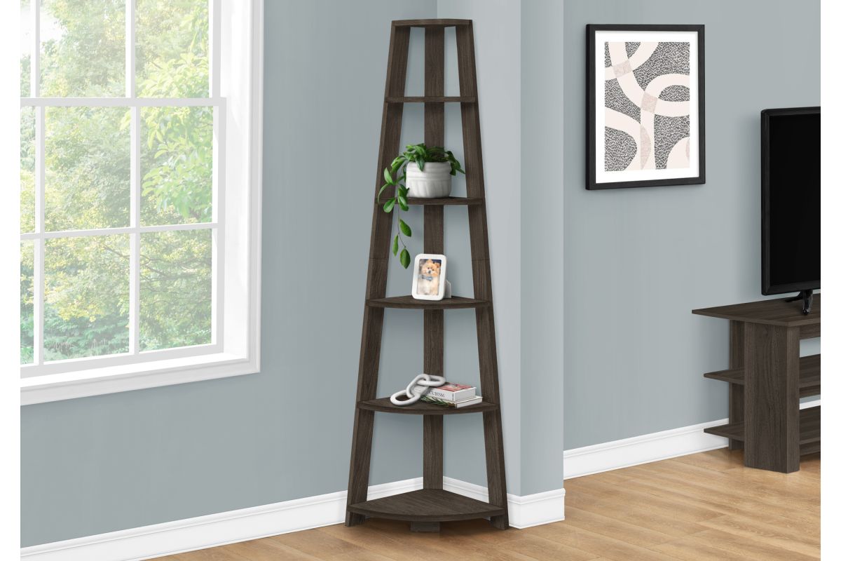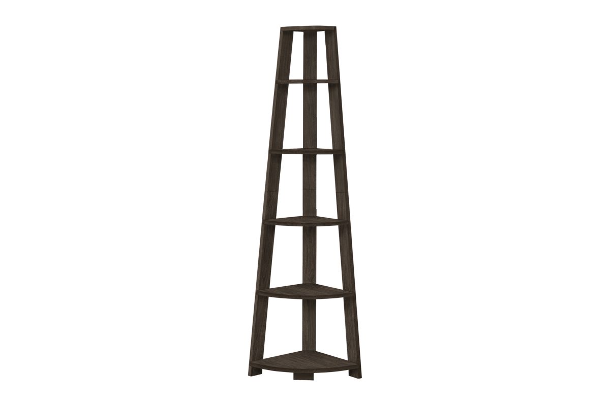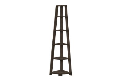 Set up this etagere bookcase easily and let it do its thing! Look how nice the bookcase fits in a corner of your living room, office or bedroom, allowing you to showcase books and all types of decor easily. Make use of a spot that is often tough to work with: the corner. Maximize storage and display with a modern piece that will be sure to help you utilize all the space available to you thanks to 5 fixed tray style shelves. Three sturdy beam legs ensure structural integrity to this corner ladder shelf in a brown oak finished wood look texture. Anti-tipping hardware is included for further stability.