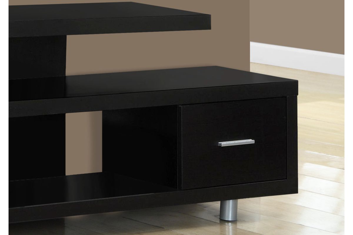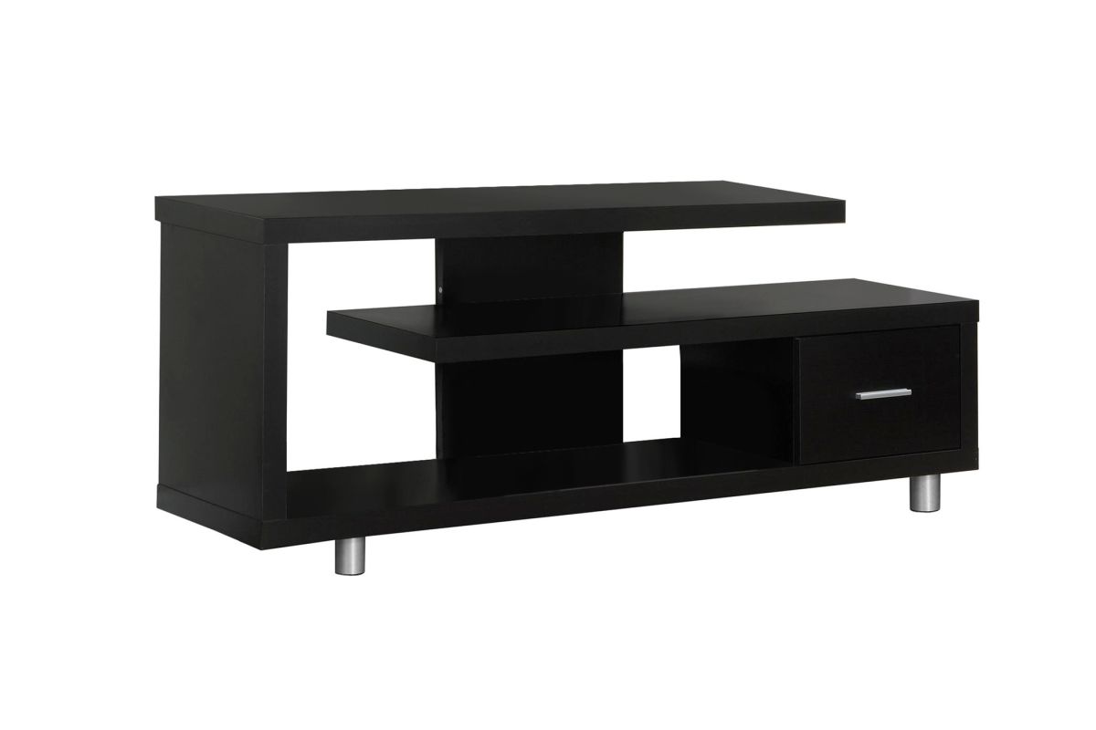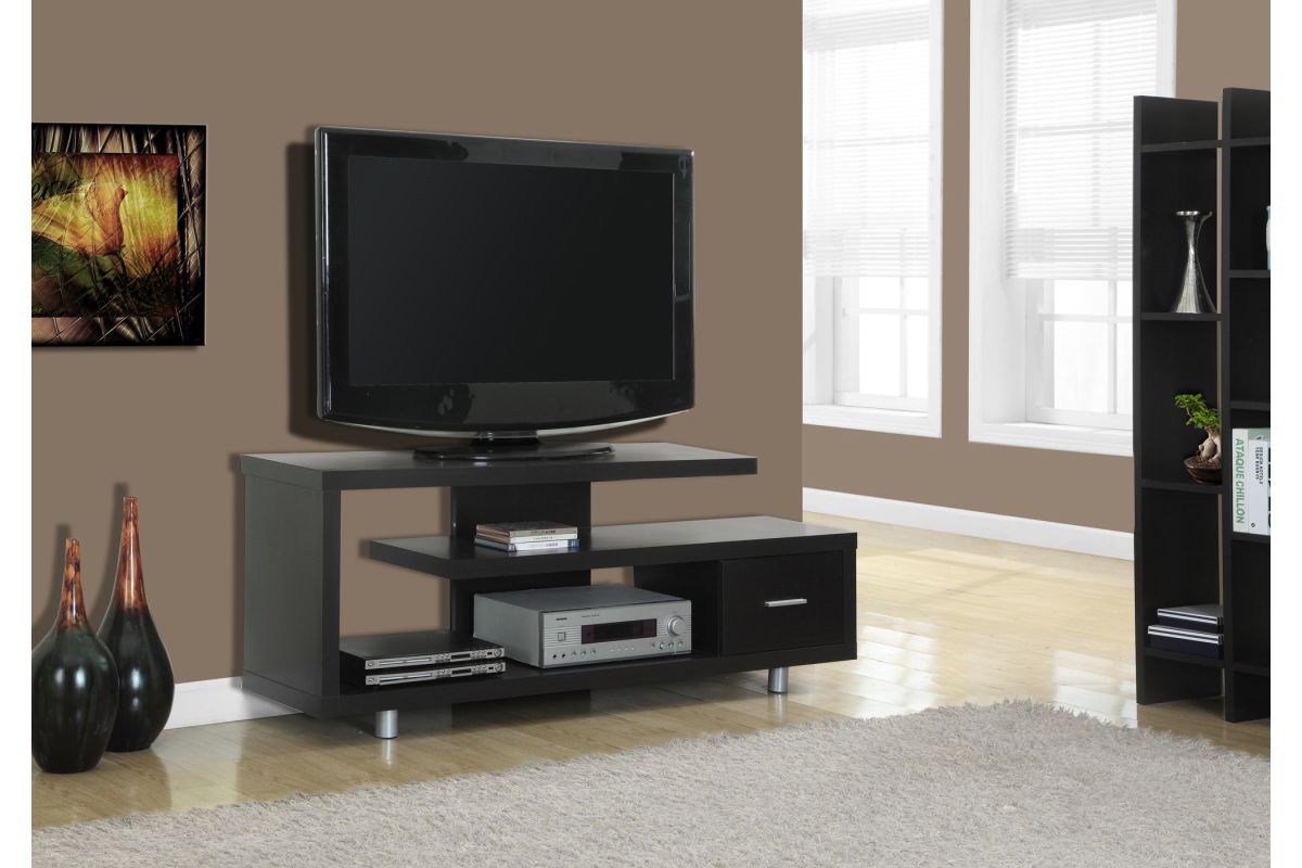 Enhance the look of your living space with the contemporary styling of this Art-Deco inspired TV stand. Constructed with thick panels in a rich, dark-brown espresso finish on all sides and two sturdy round metal legs; this stand features open concept shelving and one drawer ideal for media storage solutions. This console unit accommodates all TV sizes with a center stand and will be a stand out in your living room, family room, den, or basement space.