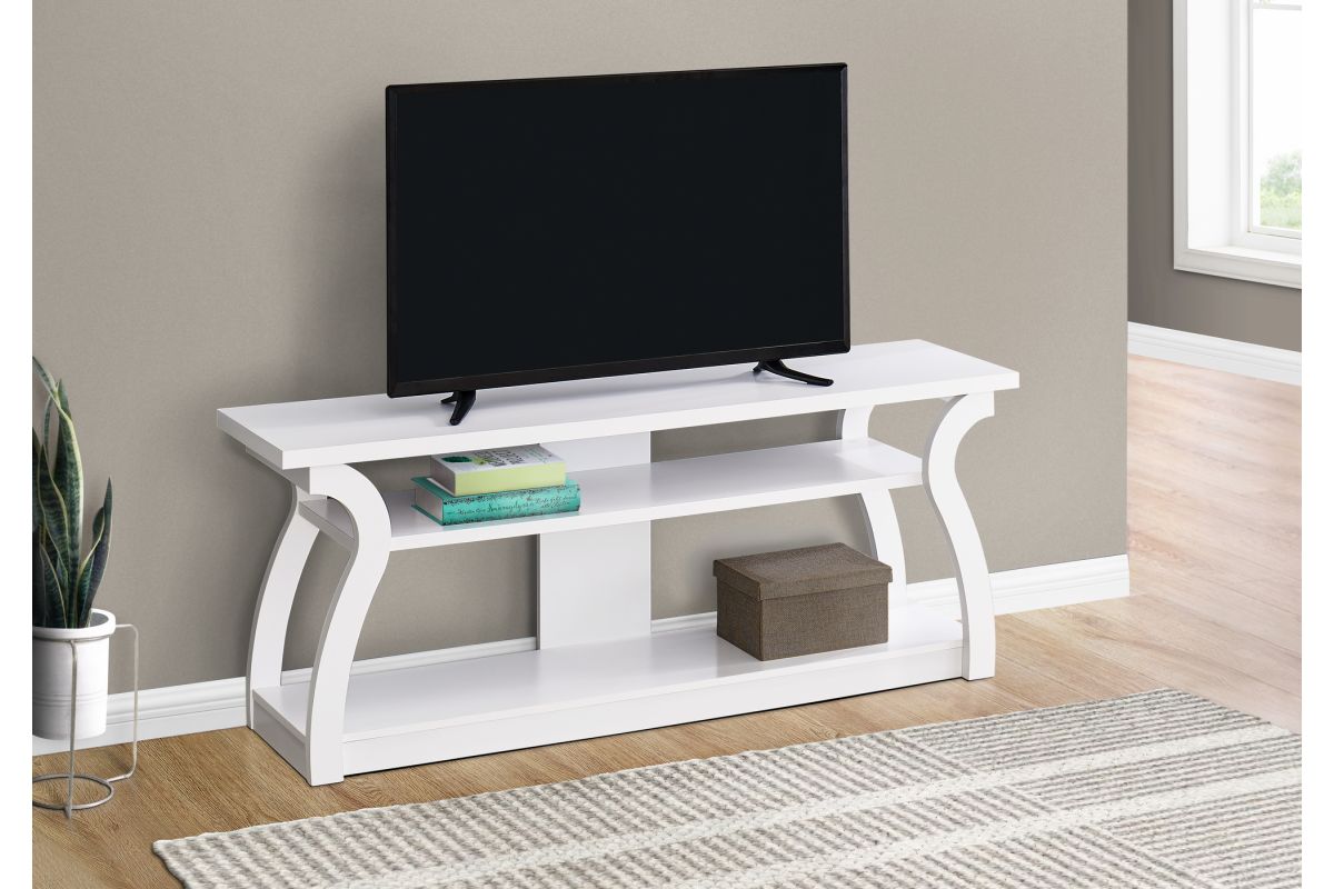 - 60-inch TV stand in a white finish with sturdy, thick-panel construction and unique, curved sides