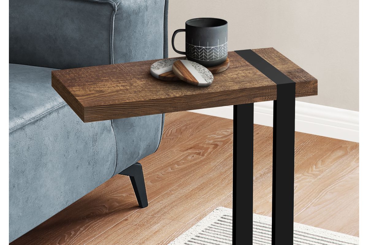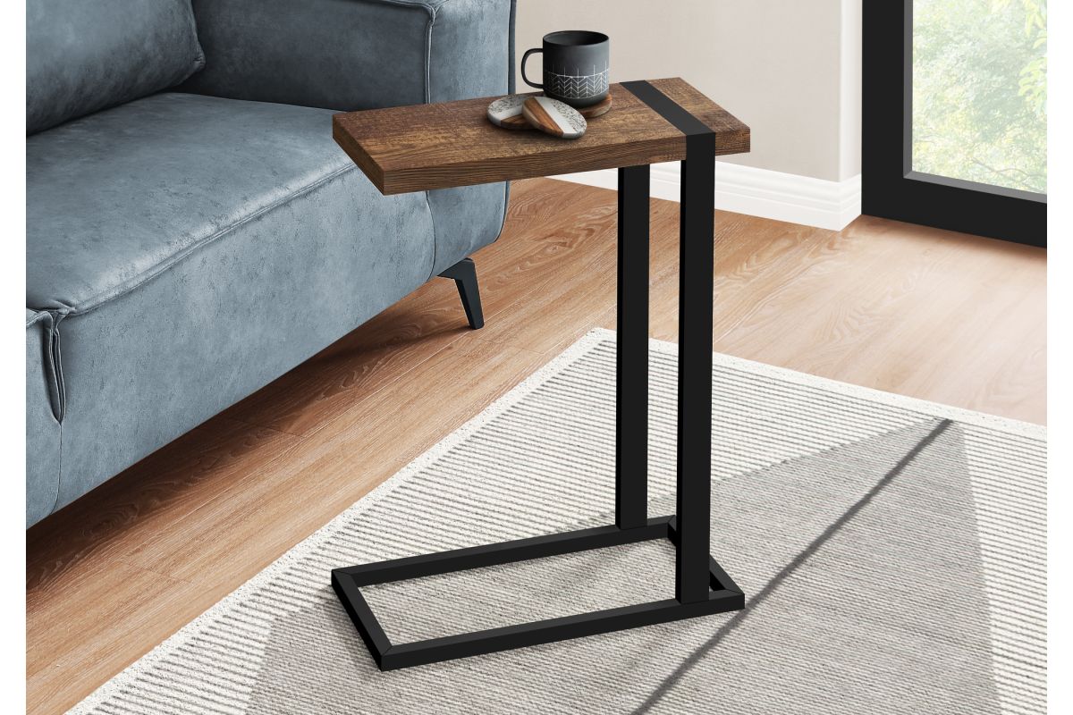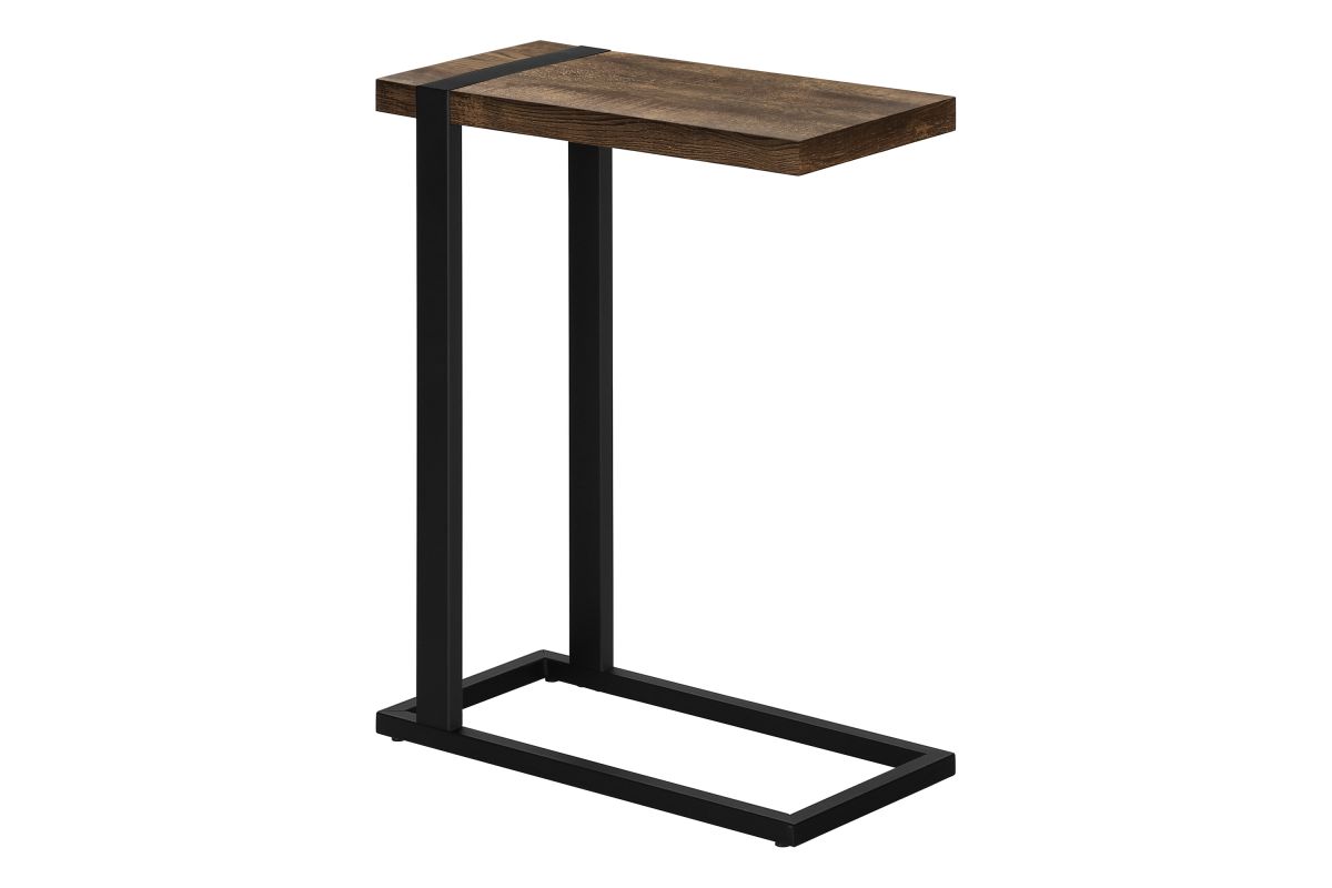 Industrial-farmhouse style combines modern metal with a rustic wood finish to create a warm, inviting look. This C-shaped accent table embodies that popular style. The tabletop is finished in a brown reclaimed-wood look with naturalistic color variations and a subtle wood-grain texture. The robust metal frame in a black finish is incorporated into the thick tabletop for a striking visual contrast and to provide stability. Lightweight and finished on all sides, this C table can be slid under a sofa or chair in a living room or used as a side table in a bedroom.