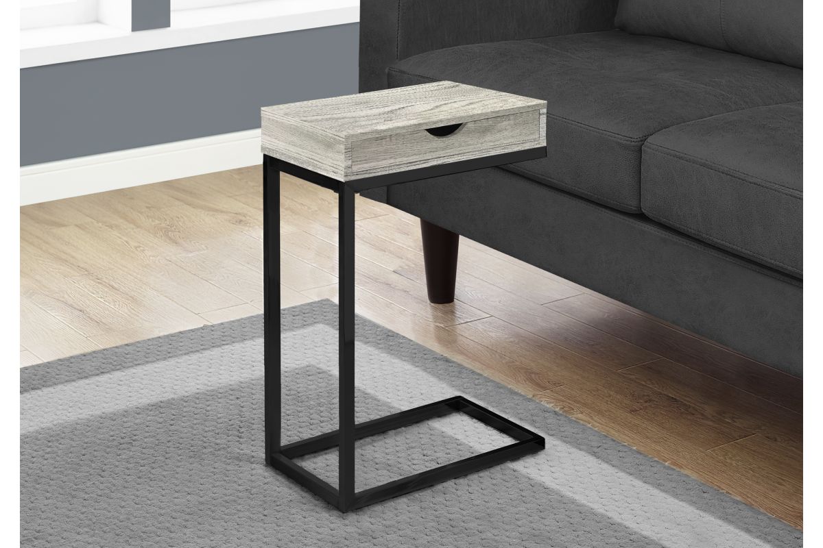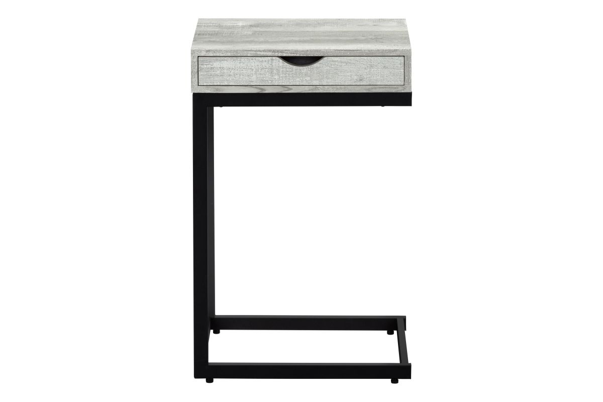 With a whole lot of classiness, this industrial C shape side and end table also comes with all the practicality you need. An ideal fit alongside your sofa or bed, the accent table is perfect for your small home, apartment or condo and will surely bring more jazz to your movie night, study session or quiet time. Featuring a trending grey reclaimed wood look, the sturdy black metal base sits slightly off the ground to prevent damage to your floor. Don't forget a convenient storage drawer for any living room accessories such as remotes, coasters, magazines or more. Make this your new favorite living room piece.