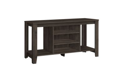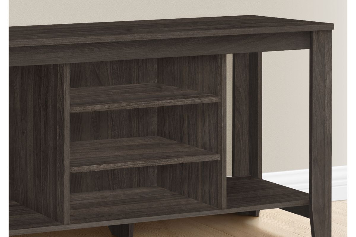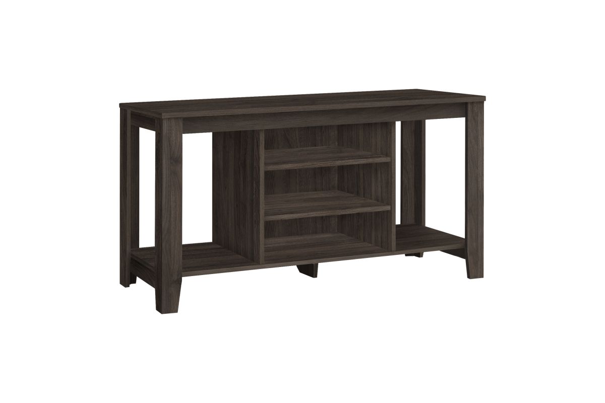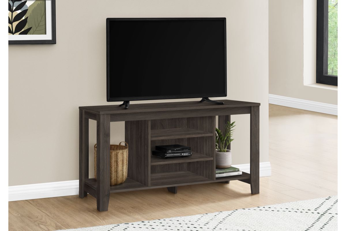 In a versatile design that fits all decor styles, all your components will stay organized thanks to this brown oak wood look TV stand that has two adjustable center shelves, an additional bottom shelf and two large side shelves. It is the transitional style media storage solution you need in the living room of your small home, condo, apartment or dorm room that frees up valuable space. This unit accommodates all TV sizes equipped with a center stand thanks to a solid base.
