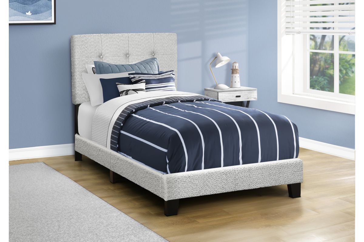 Create a fashionable style bedroom space for a youth with this trendy, twin size bed frame in a light grey boucle fabric and black, block style plastic feet. This transitional style upholstered bed is designed with a classic, button-tufted padded headboard for comfortable support. The sturdy construction of the low profile, solid engineered wood frame and wooden slats to support a standard twin size box spring and mattress (not included) ensures long-lasting durability. Easy to assemble with illustrated instructions included and all required parts and hardware are found inside the back of the headboard for convenience. Backed by a 2 year limited warranty against manufacturer defects, this quality made bed frame is the perfect addition in a juvenile or teen bedroom for a cozy feel. A box spring is required (not included) for additional support, mattress not included. This bed is for the frame only.