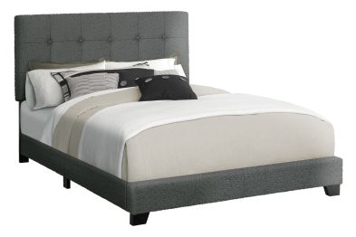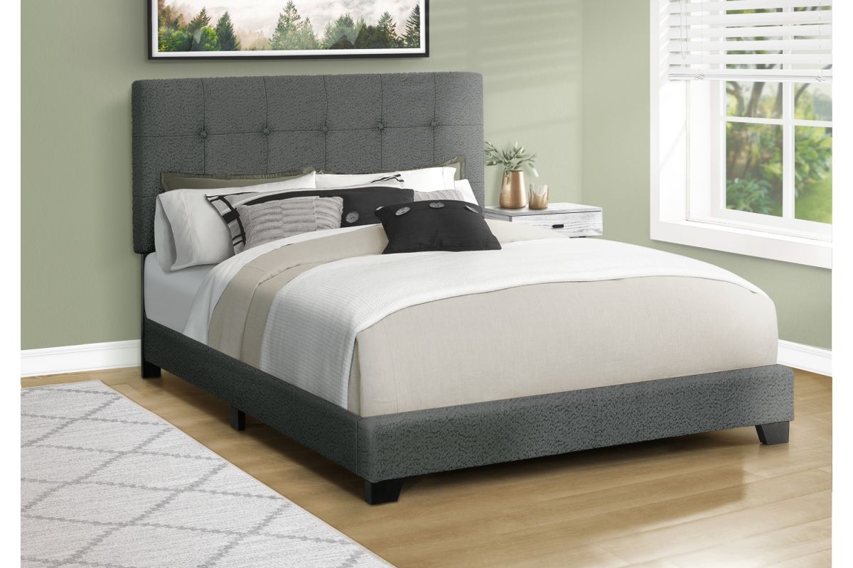 Create a sanctuary with fashionable style in your bedroom starting with this chic and trendy queen size bed frame in a dark grey boucle fabric and plastic, black block feet. This transitional style upholstered bed is designed with a classic, button-tufted padded headboard where you can lean back for comfortable support. The sturdy construction of the low profile, solid engineered wood frame and wooden slats to support a standard queen size box spring and mattress (not included) ensures long-lasting durability. Easy to assemble with illustrated instructions included and all required parts and hardware are found inside the back of the headboard for convenience. Backed by a 2 year limited warranty against manufacturer defects, this quality made bed frame is the perfect addition fashion-forward bedrooms with a cozy style. Please note a box spring is required (not included) for additional support, mattress not included. This bed is for the frame only.