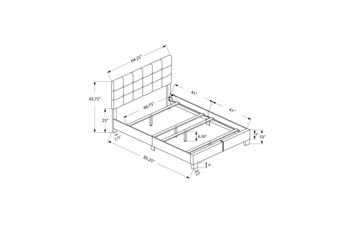 - Low-profile bed frame with a classic button-tufted headboard with thick, comfortable padding; frame only, queen size box spring and mattress not included.