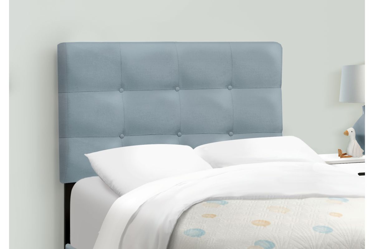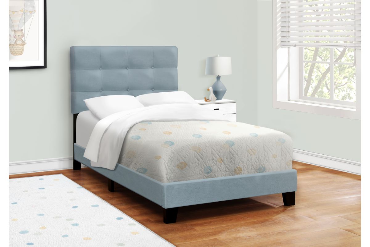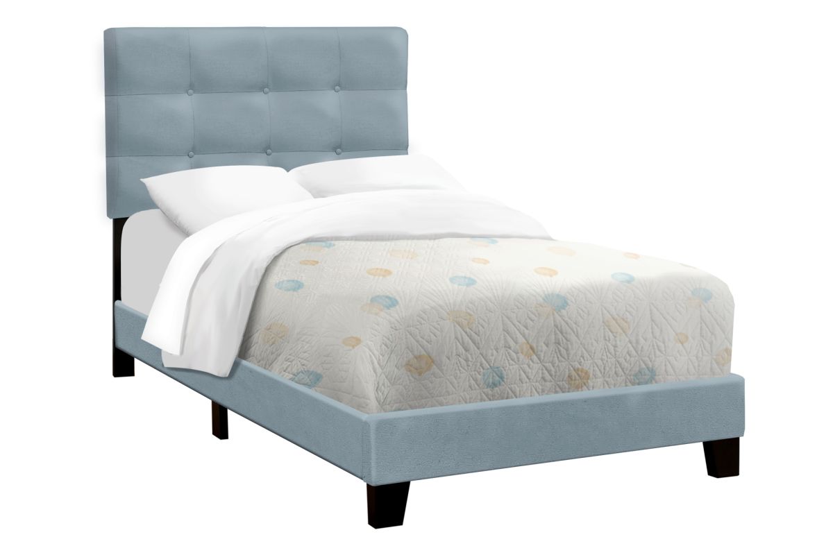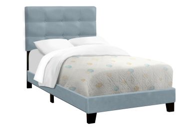 Create a striking look in the bedroom with this twin size platform bed frame. Covered in a chic light blue velvet, soft touch fabric over thick foam cushioning along the tufted backrest and sides for a cozy feel. The upholstered solid engineered wood frame is fitted with wooden slats along the base for solid support, and black block style plastic legs for increased load-bearing weight and stability. Ideal for youth and juvenile spaces, this comfortable, upholstered bed is perfect in small homes, apartments or condos. Built with sturdy construction, this easy to assemble bed includes a 2 year limited warranty against manufacturer's defects for your comfort. Spruce up your teen's room in fashionable style with this transitional bed frame that comes in an array of fabulous colors. All parts and hardware for assembly are conveniently located inside the headboard. This bed includes the headboard and frame only. A box spring and mattress is required but not included (low profile recommended).