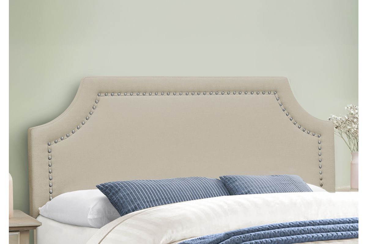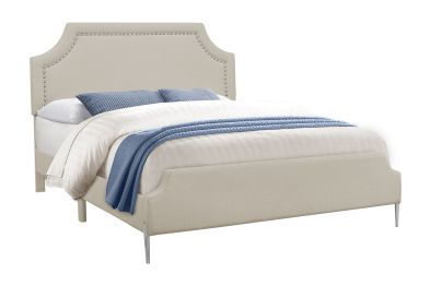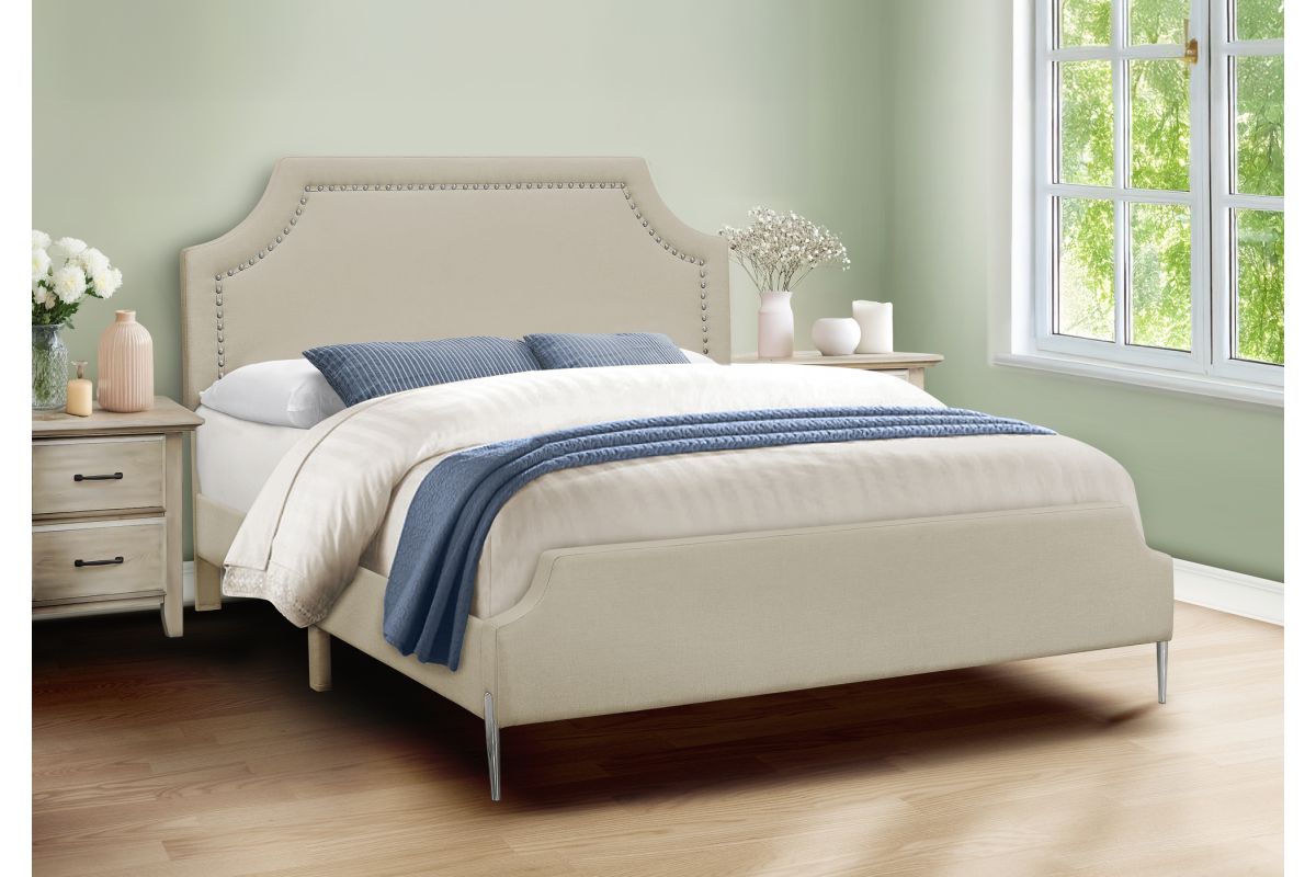 - Queen size contemporary platform bed frame upholstered in an elegant beige linen-look fabric over foam padding on all sides, with chrome nail-head trim on the arched cut-out headboard for a subtle glamourous touch