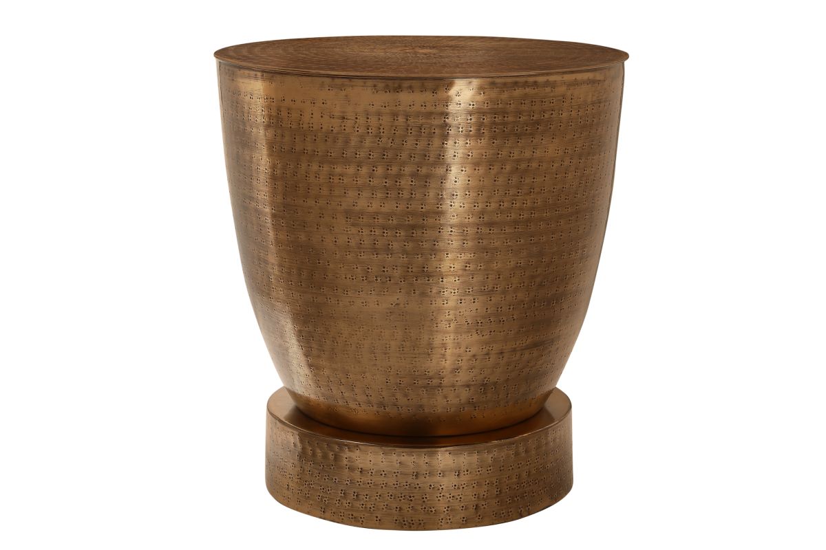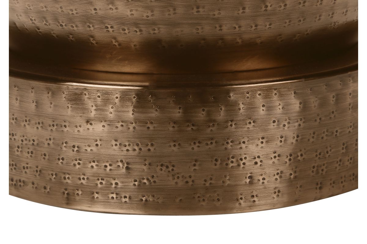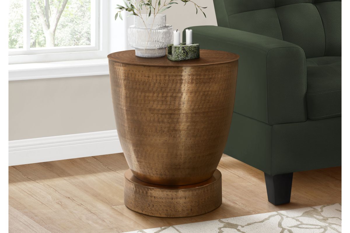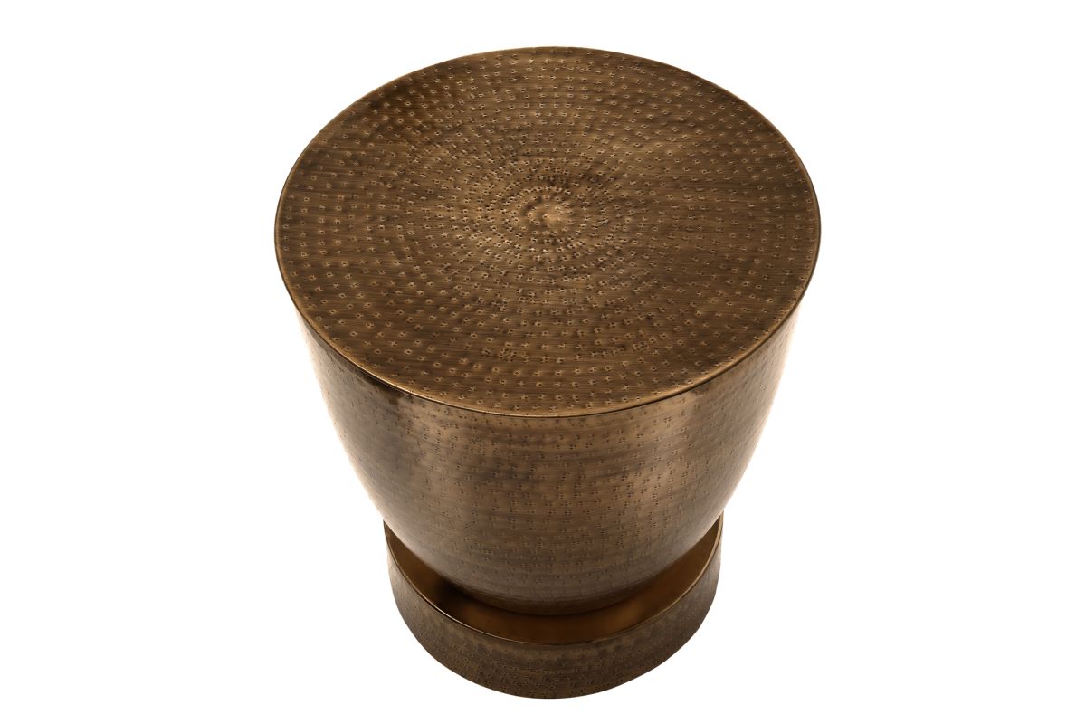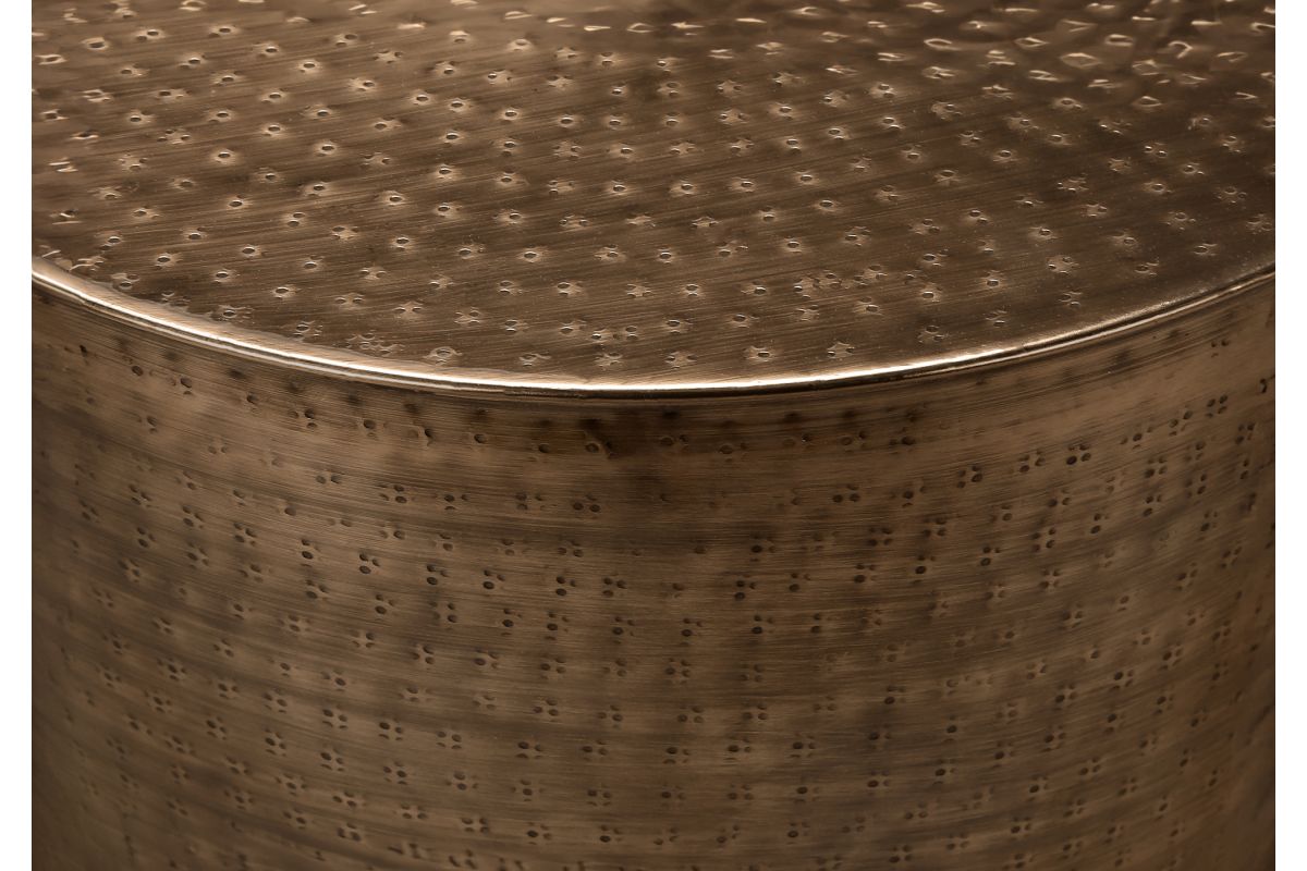 - This hand-crafted, 22" high metal drum accent table, sits on a sturdy, round pedestal base in a copper metal finish, with a subtle hammered-look all over for a boho-glam look in a living room or bedroom.