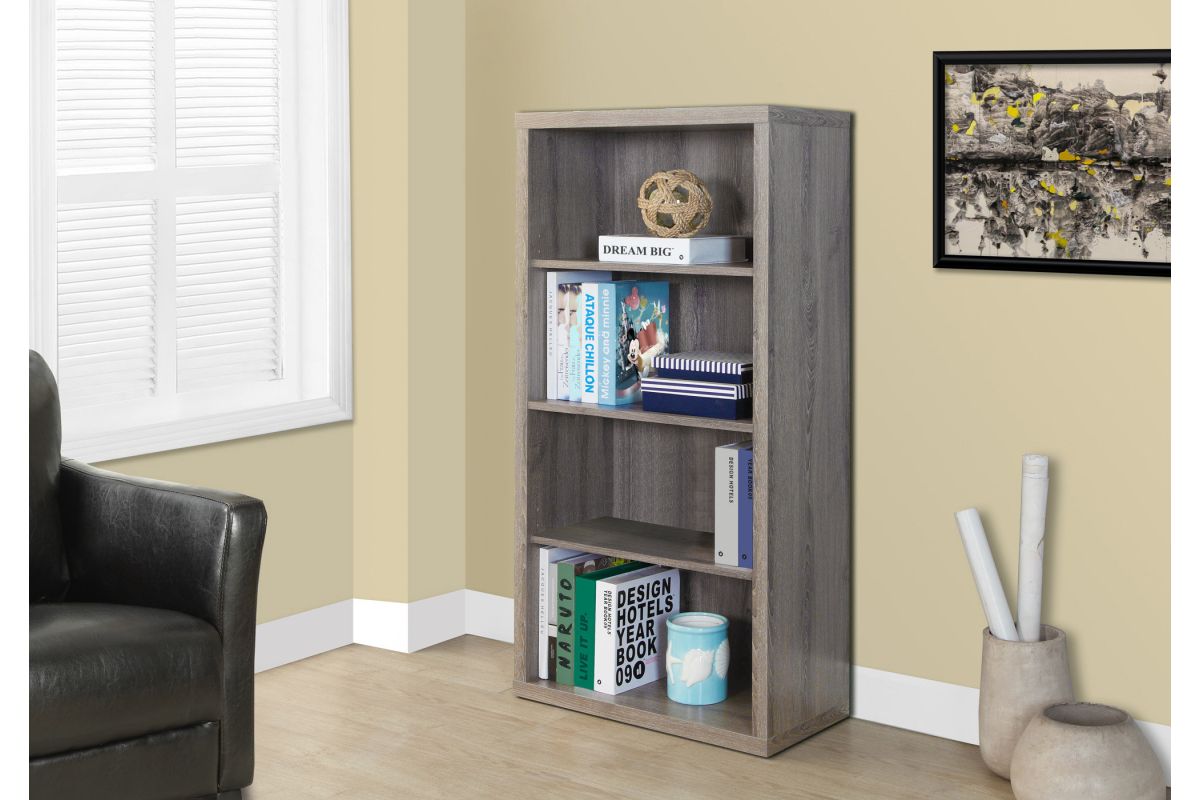 - 4-shelf bookcase in a dark taupe wood-look finish on all sides to make a real statement in your living space
