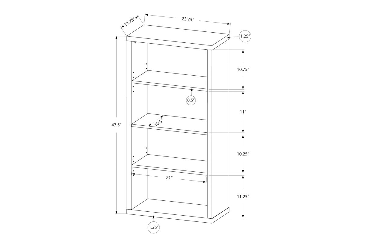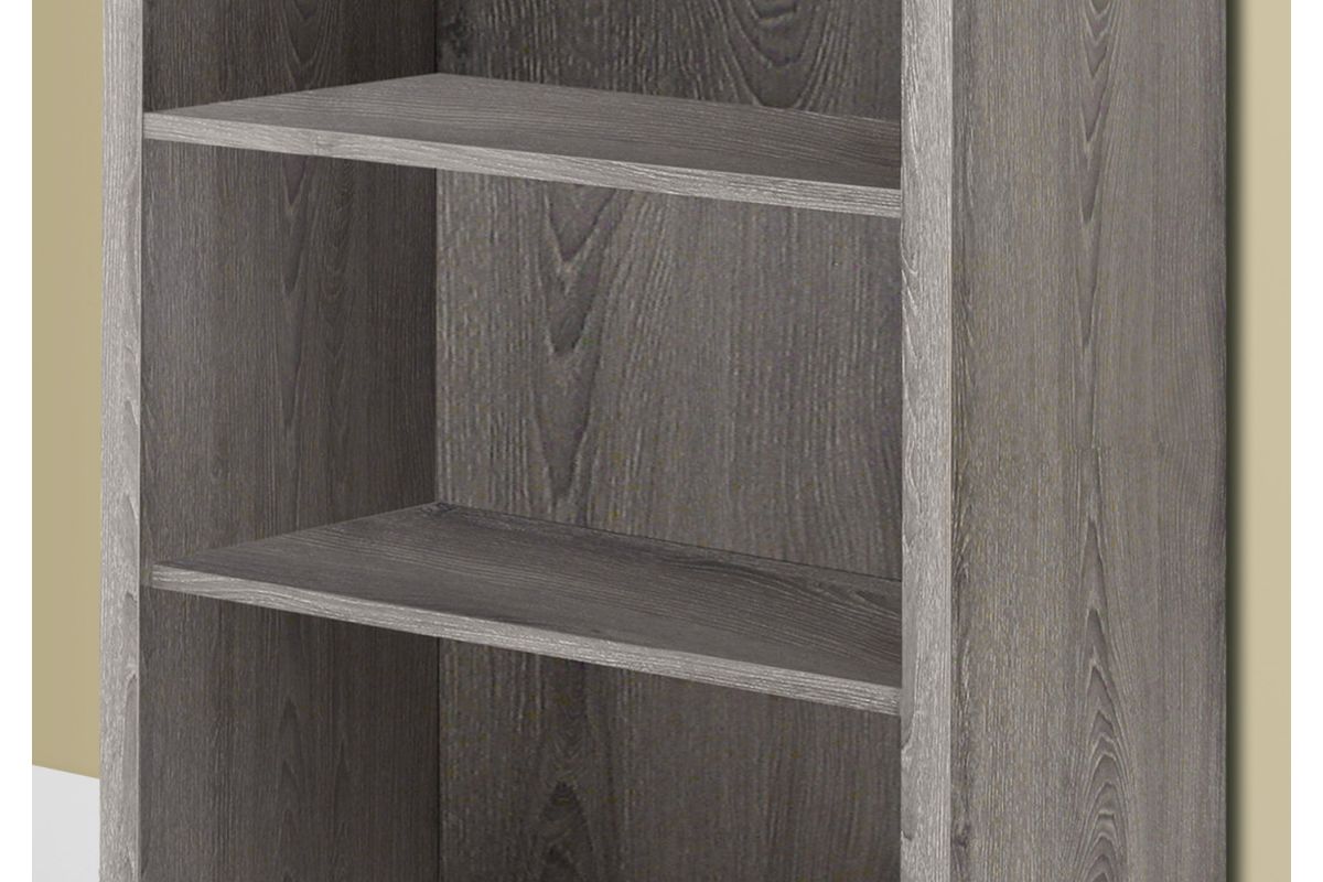 Sleek and contemporary, this dark taupe wood-look 48" bookcase is the perfect combination of design and function. With clean lines and thick panels, this book case will keep you organized in style. Featuring three adjustable shelves to accommodate various sized books and decorative objects, this bookcase can stand alone or be paired with the matching desk and mobile stand for your home office, bedroom, den, or living room.