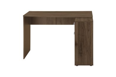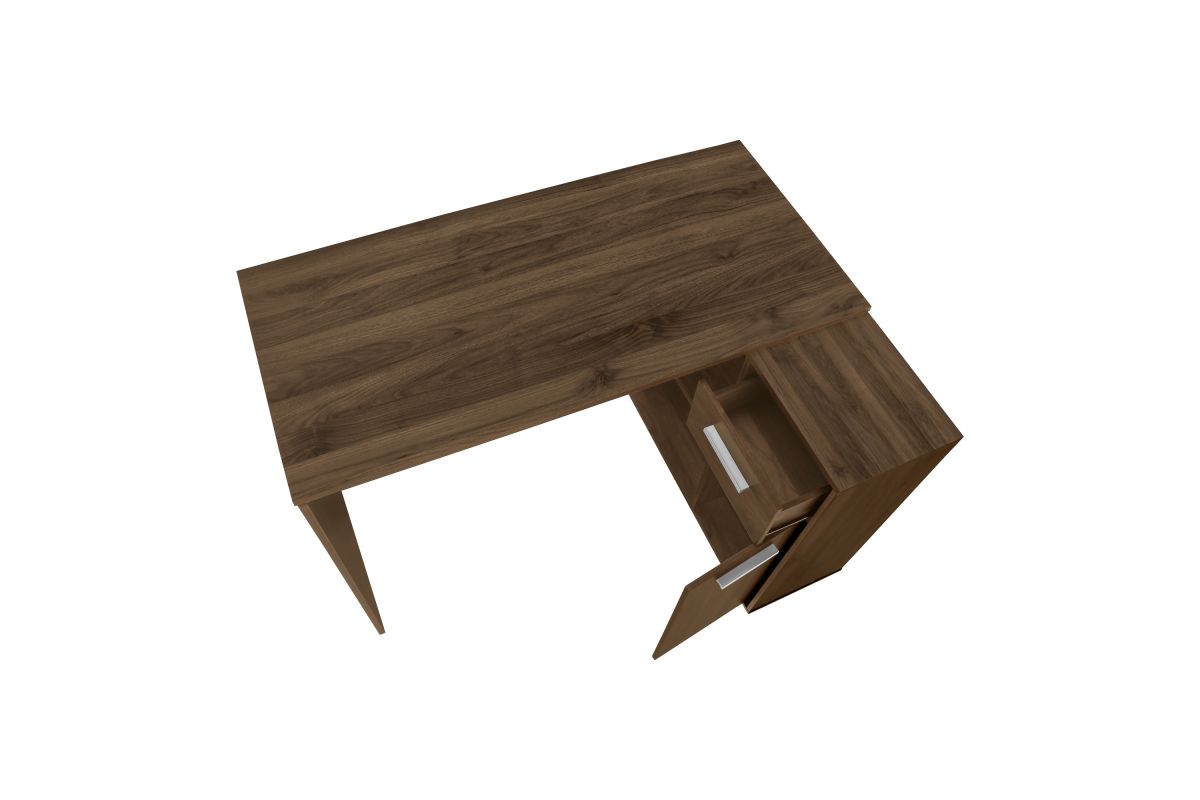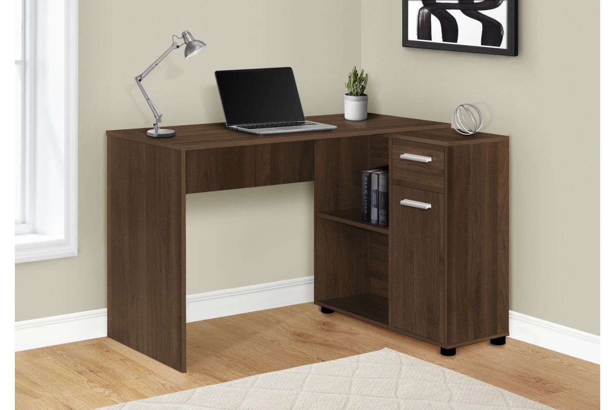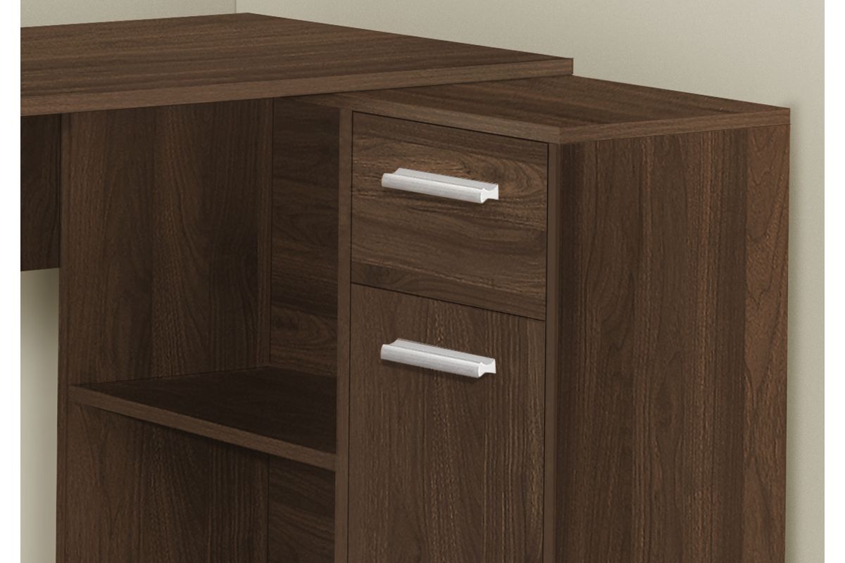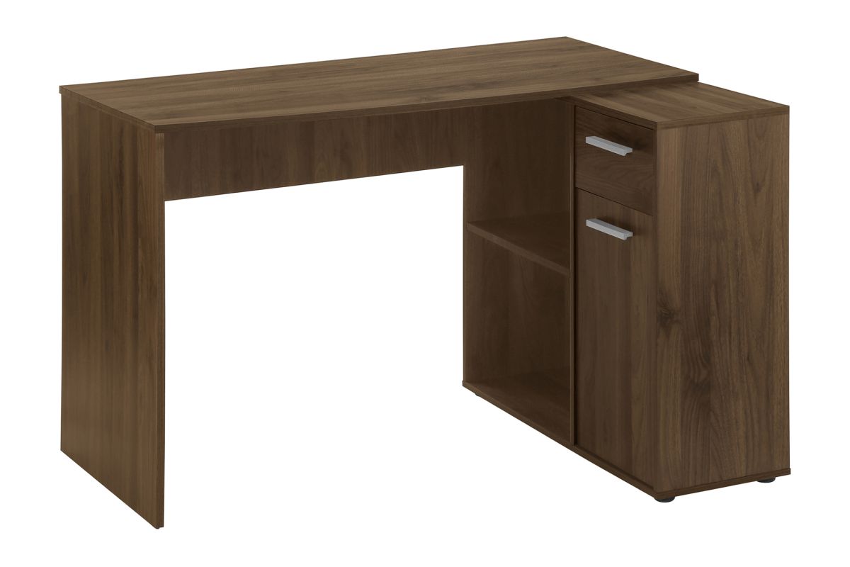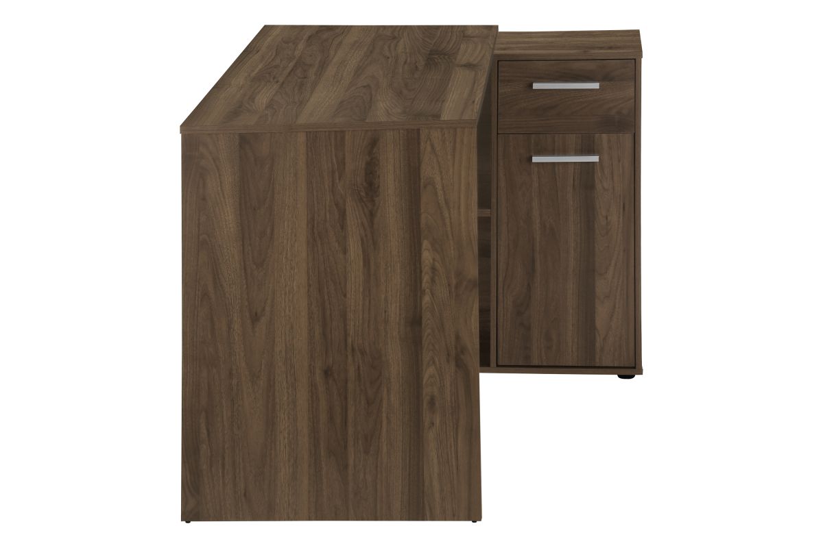 With a generous worksurface and built-in storage, this L-shaped computer desk is ideal for students or home offices with limited space. The main desktop panel overlaps the storage unit on the right to create a second, slightly lower worksurface. The convenient storage unit provides space to neatly organize reference books and school supplies. It features 2 cubbies with 1 fixed shelf panel, 1 storage drawer, and 1 cabinet, both of which have finished interiors and silver handles. Finished on all sides in a dark walnut wood-look laminate, this space-saving juvenile desk is intended for placement in a corner but can be positioned anywhere in a child's bedroom, dorm room, or home office.