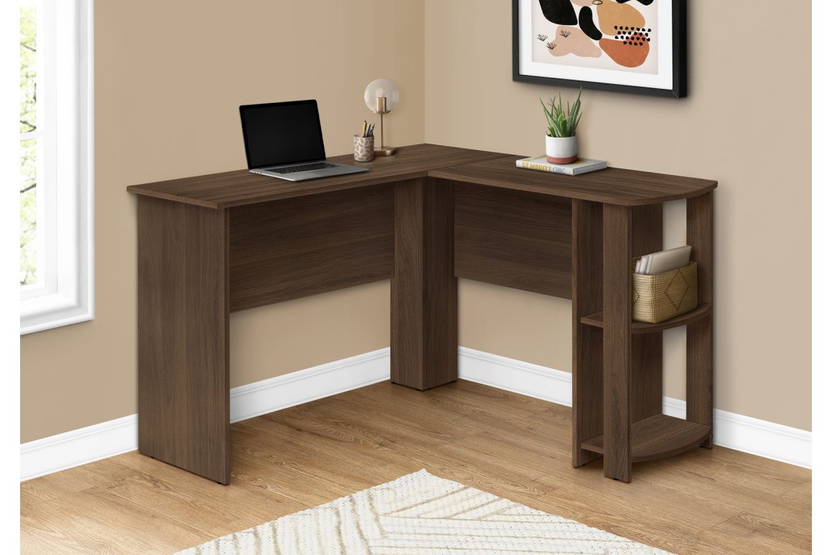 - L-shaped computer desk with storage in a wood-look finish