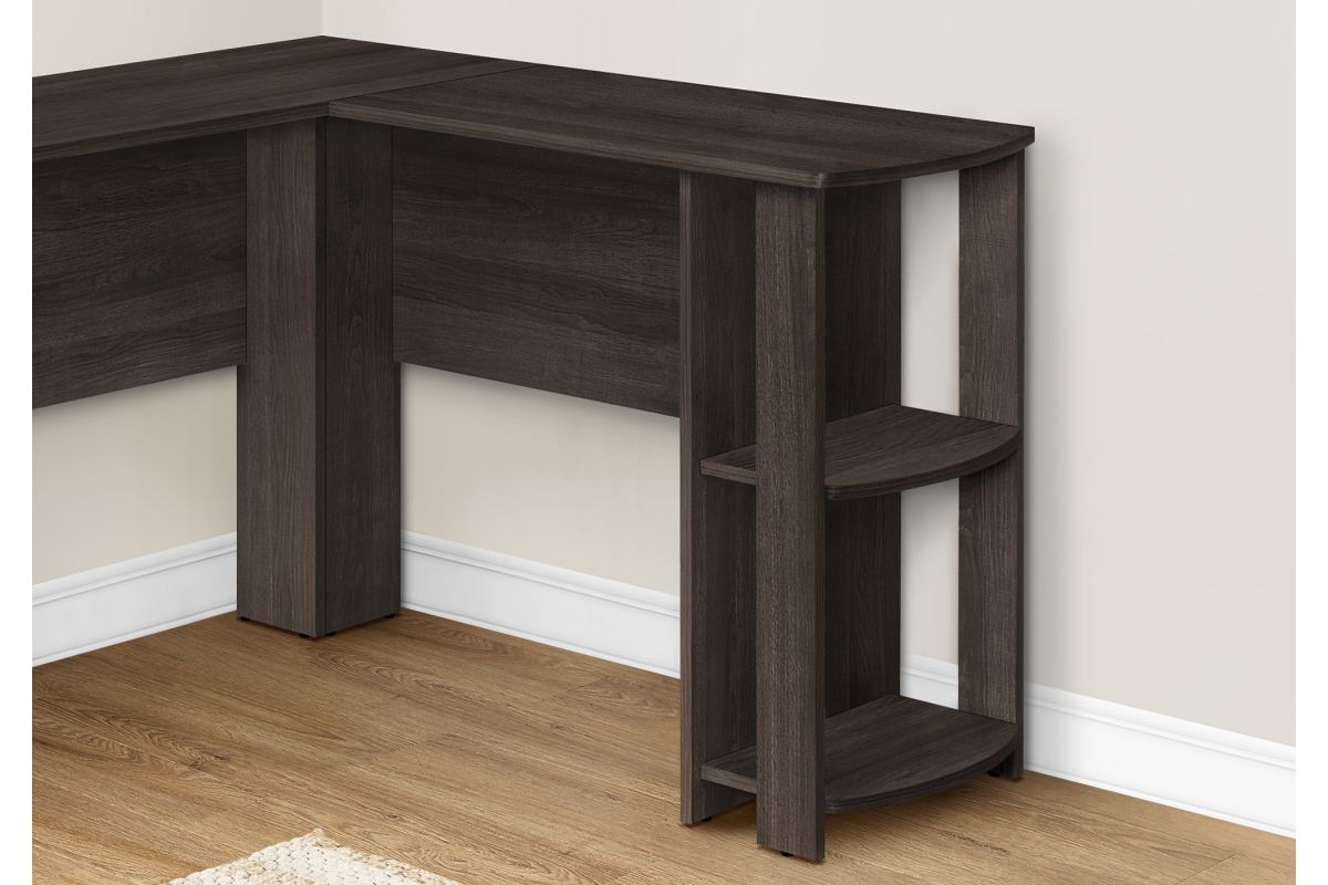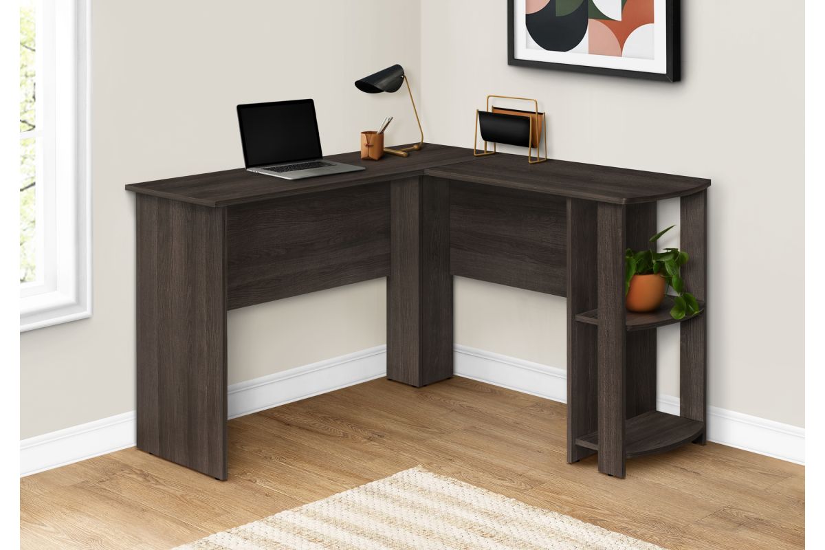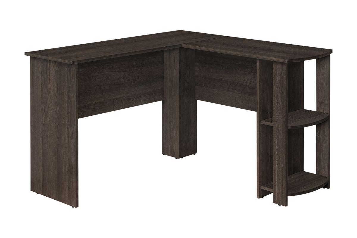 With a generous worksurface and built-in storage, this L-shaped computer desk is ideal for students or home offices with limited space. Two convenient storage units provides space to neatly organize reference books and school supplies. Finished on all sides in a wood-look laminate, this space-saving juvenile and versatile desk is intended for placement in a corner but can be positioned anywhere in a child's bedroom, dorm room, or home office.