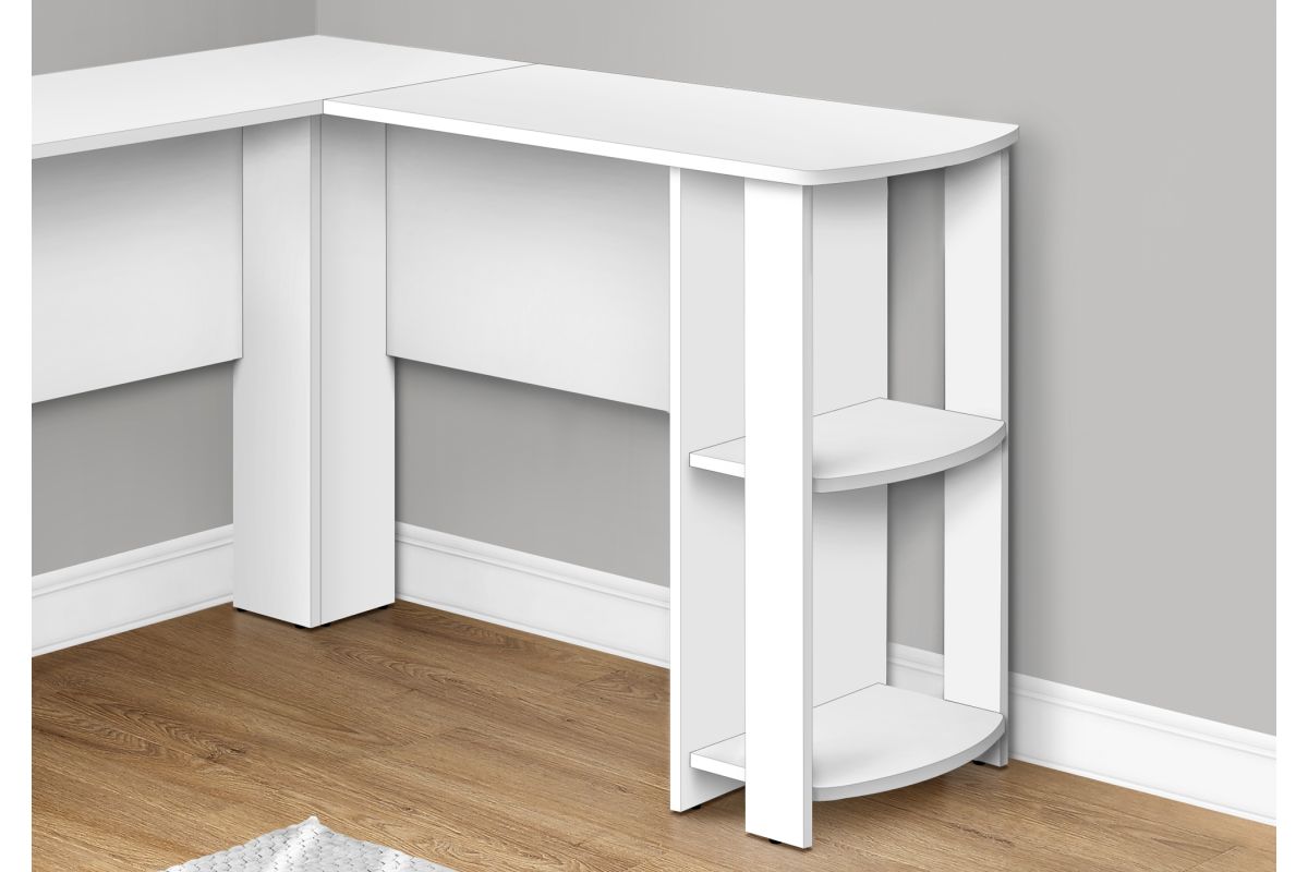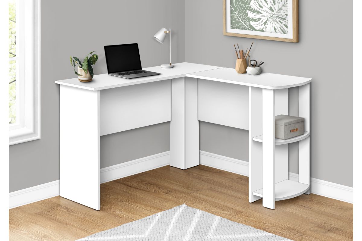With a generous worksurface and built-in storage, this L-shaped computer desk is ideal for students or home offices with limited space. Two convenient storage units provides space to neatly organize reference books and school supplies. Finished on all sides in a wood-look laminate, this space-saving juvenile and versatile desk is intended for placement in a corner but can be positioned anywhere in a child's bedroom, dorm room, or home office.