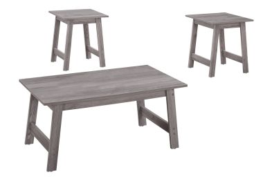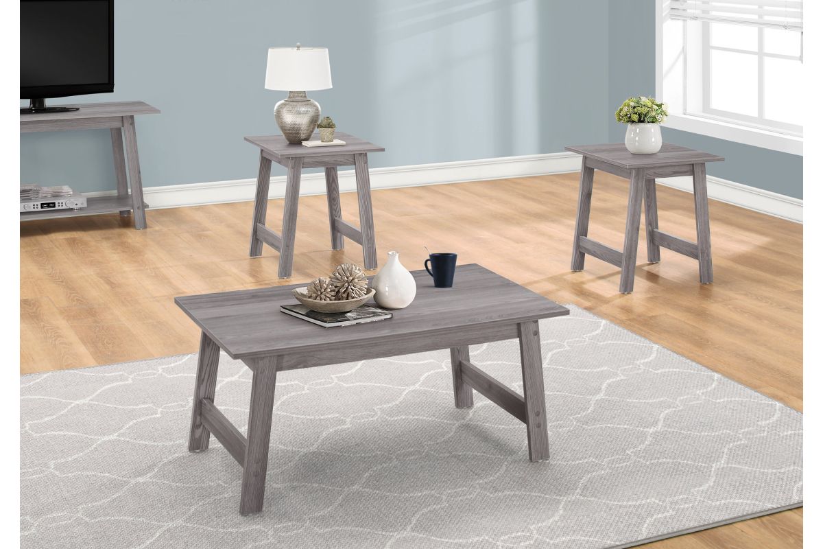Bring some warmth and style to your living room, den, or family room with this modern 3 piece rectangular coffee table set in a rich grey wood-look finish. The table tops are spacious enough to place books, a lamp, or decorative accessories, and the angular sturdy legs with a cross bar keep the look clean yet stylish. With a simple minimalist design, this rectangular coffee table with two matching square end tables is perfect for small spaces easily fitting into any décor style.