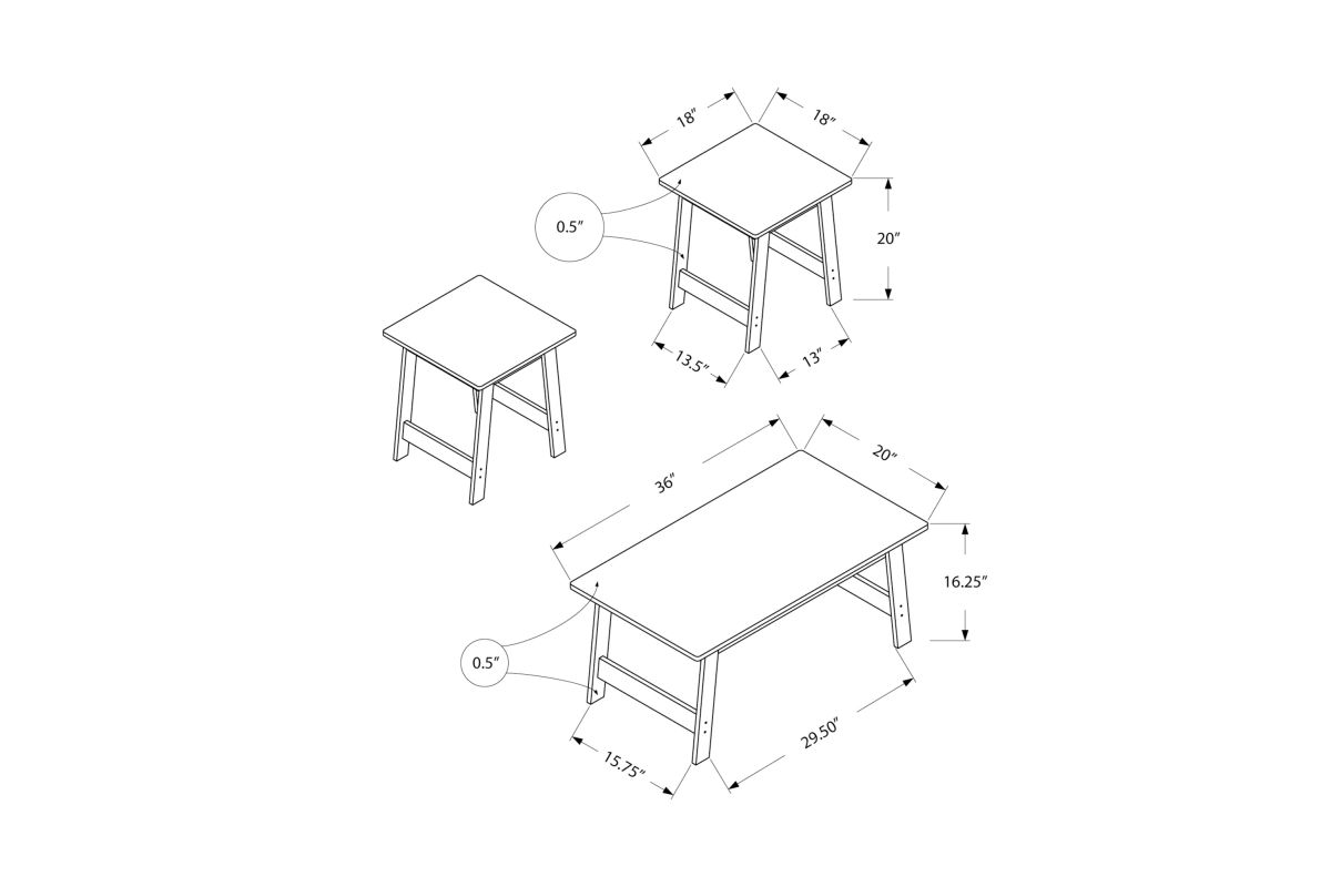 - Coffee table: 36 in. W x 20 in. D x 16.25 in. H; Each end table: 18 in. L x 18 in. W x 20 in. H