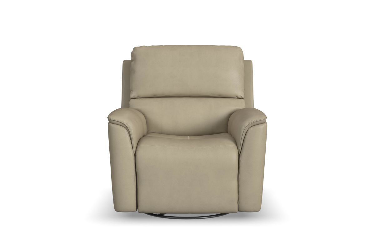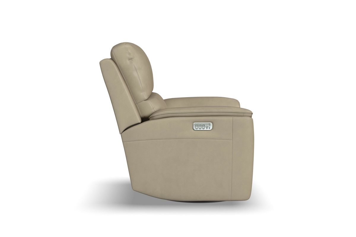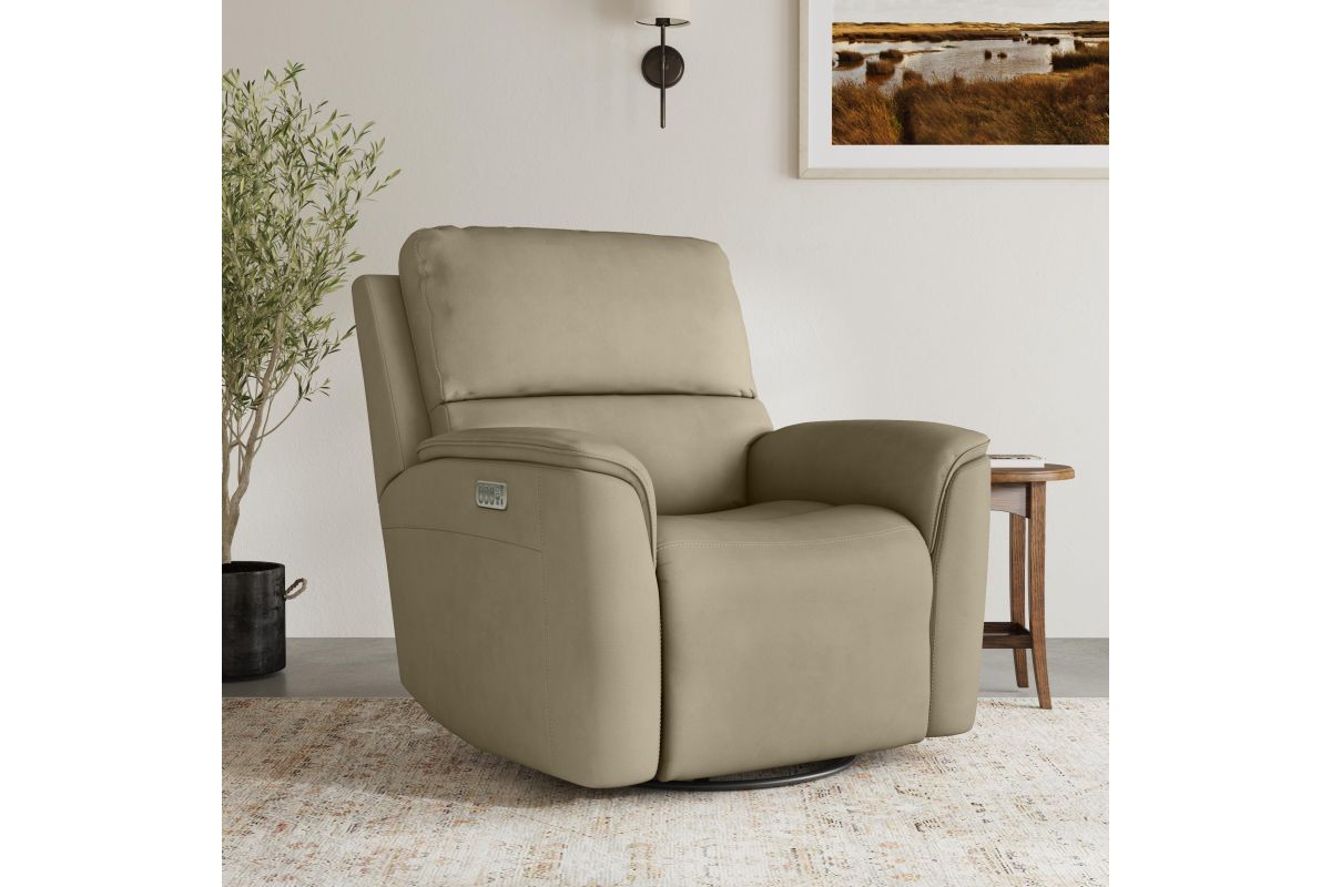 Treat yourself to a comfortable yet refined sitting experience with the Oliver leather power swivel recliner with power headrest and lumbar. This generously scaled frame is upholstered in a durable, sumptuous leather, and features a contoured seat and padded arms with a unique sculptural shape and welt trim. Power recline, headrest and lumbar control on the right side allows for customized comfort, and an included USB port provides convenient device charging. The Zero Gravity recline technology gives the feeling of weightlessness while Flexsteel's patented Blue Steel Spring™ provides lasting seat support.