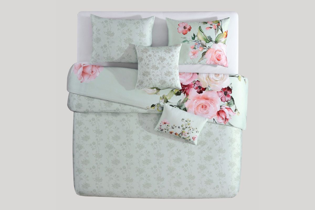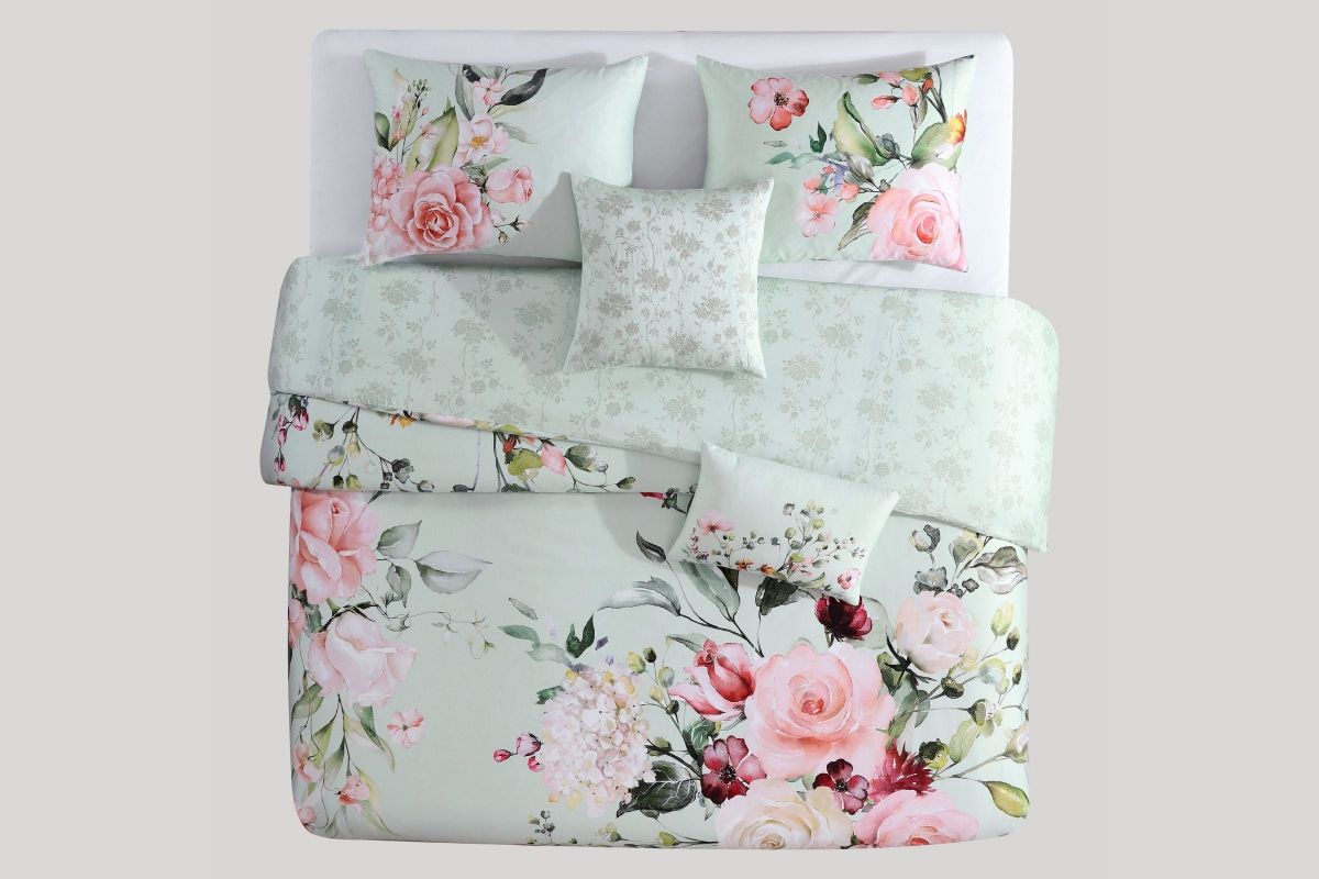 Add a touch of romantic charm with the Bebejan Rose on Misty Green Comforter Set. Made from silky 200 thread count 100% cotton sateen, this 5-piece reversible set features soft rose motifs over a calming green backdrop for a serene, stylish look.