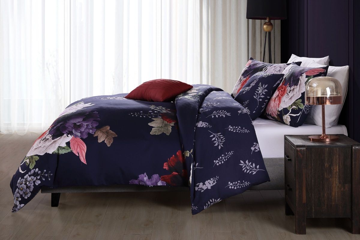 - A deep, rich eggplant purple background sets the stage for a lively bouquet of large, bursting flowers on the Purple Garden 5 piece reversible comforter set. The sophisticated and appealing color palette of this grand flower garden print will enhance any bedroom, while on the other side, a tone-on-tone leaf pattern provides a calm second look. The 18x18� pillow simulates the tonal leaf pattern of the reverse, but adds embroidery. The 2 shams and 18x12� pillow, all included, are printed and the entire set is made from a luxurious 200 Thread Count 100% cotton sateen. As a bonus, the set is packaged in a reusable self-fabric tote.