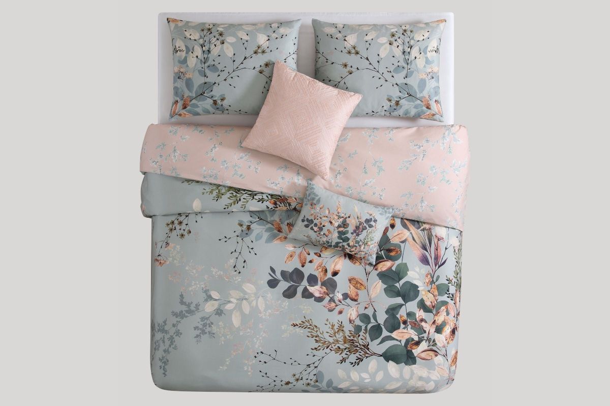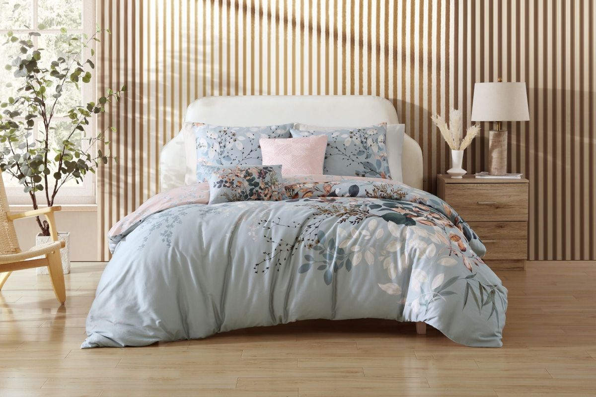 Bring nature-inspired elegance to your bedroom with the Bebejan Peach Leaves on Sage Comforter Set. Crafted from 100% cotton sateen with a silky 200 thread count, this reversible 5-piece set offers two tranquil looks in one.