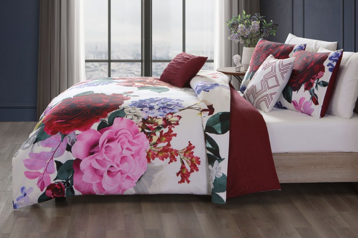 - Shades of magenta, burgundy, pink and purple form bouquets on a cream background on the Bebejan Magenta Floral 5 Piece Reversible Comforter Set.� The cheery colors will brighten any bedroom with dreams of flower gardens in full bloom.� The reverse has a printed quilt texture in a rich burgundy color that coordinates with the floral front beautifully.� The high quality 200 Thread Count 100% cotton sateen set includes 1 reversible comforter, 2 zipper shams and 2 decorative pillows.� One pillow has a geometric embroidery pattern, while the other is a fabric pleated face bringing dimension to the set.