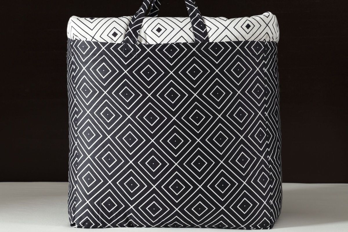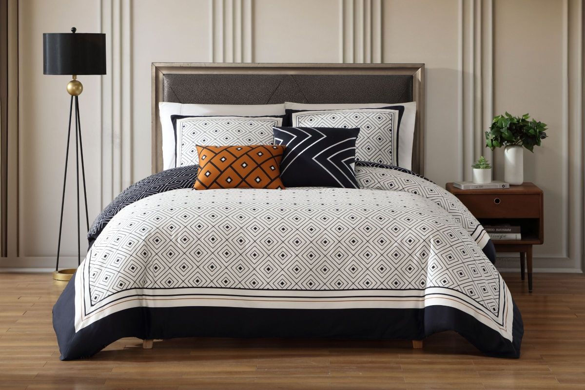 - The Geometric Black and White 5 piece reversible comforter set has a modern diamond pattern with a classic framing at its� edges. A pop of golden brown in the oblong printed pillow as well as a thin border on the comforter face adds interest. The reverse print is the direct opposite coloration of the front pattern with a black ground and white diamond pattern. This 200 Thread Count 100% cotton sateen 5 piece set also includes 2 shams, an 18x18� embroidered pillow, and a 18x12� printed pillow. As a bonus, the set is packaged in a reusable self-fabric tote.