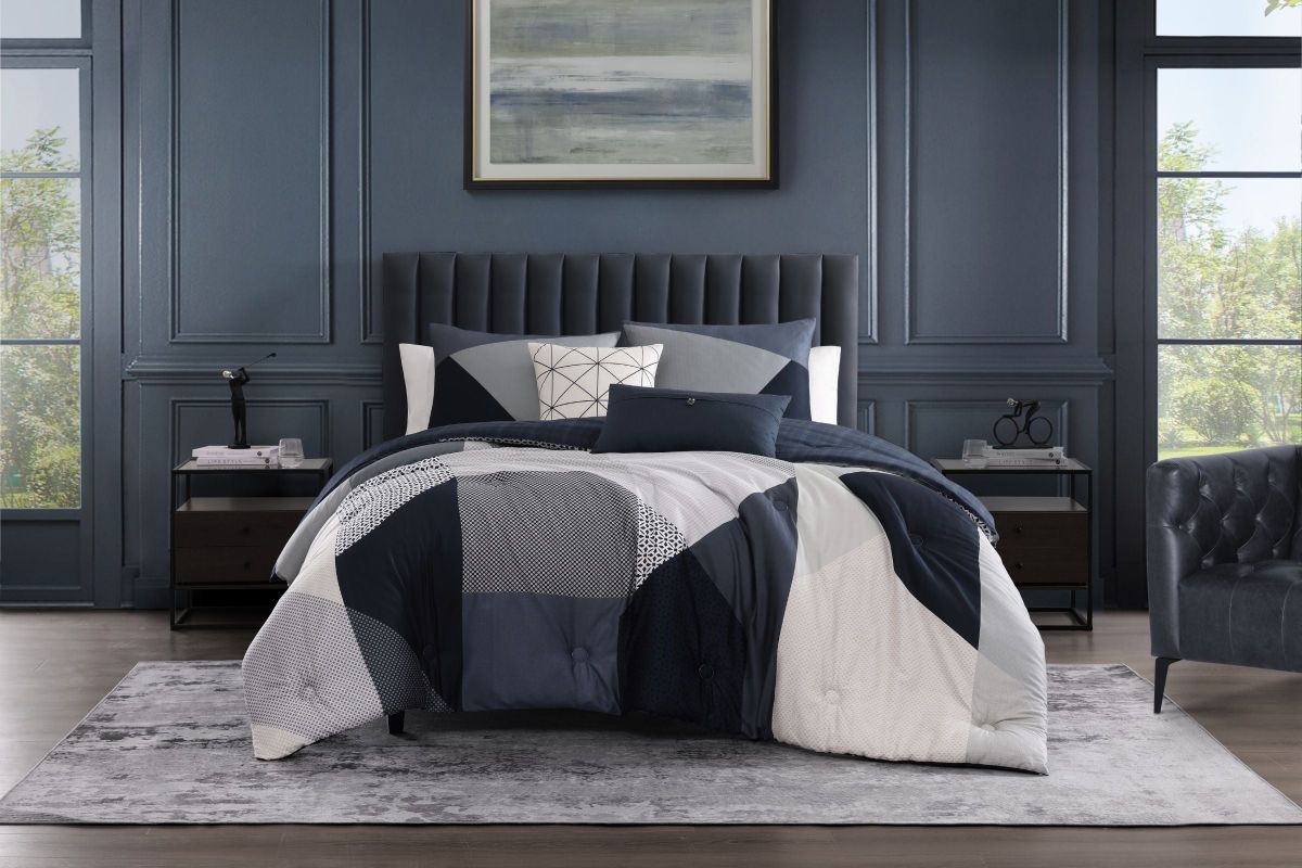 - A patchwork effect in navy, grey and ivory colors are inviting on The Geo Fusion 5 piece reversible comforter set. The reverse print is a deep textural navy for a rich look. A unique fold over oblong pillow with a button adds appeal as well as the embroidered square pillow for extra value. This 100% cotton sateen 5 piece set includes 2 shams, an 18x18� embroidered pillow, and a 22x12� printed pillow. As a bonus, the set is packaged in a reusable self-fabric tote.