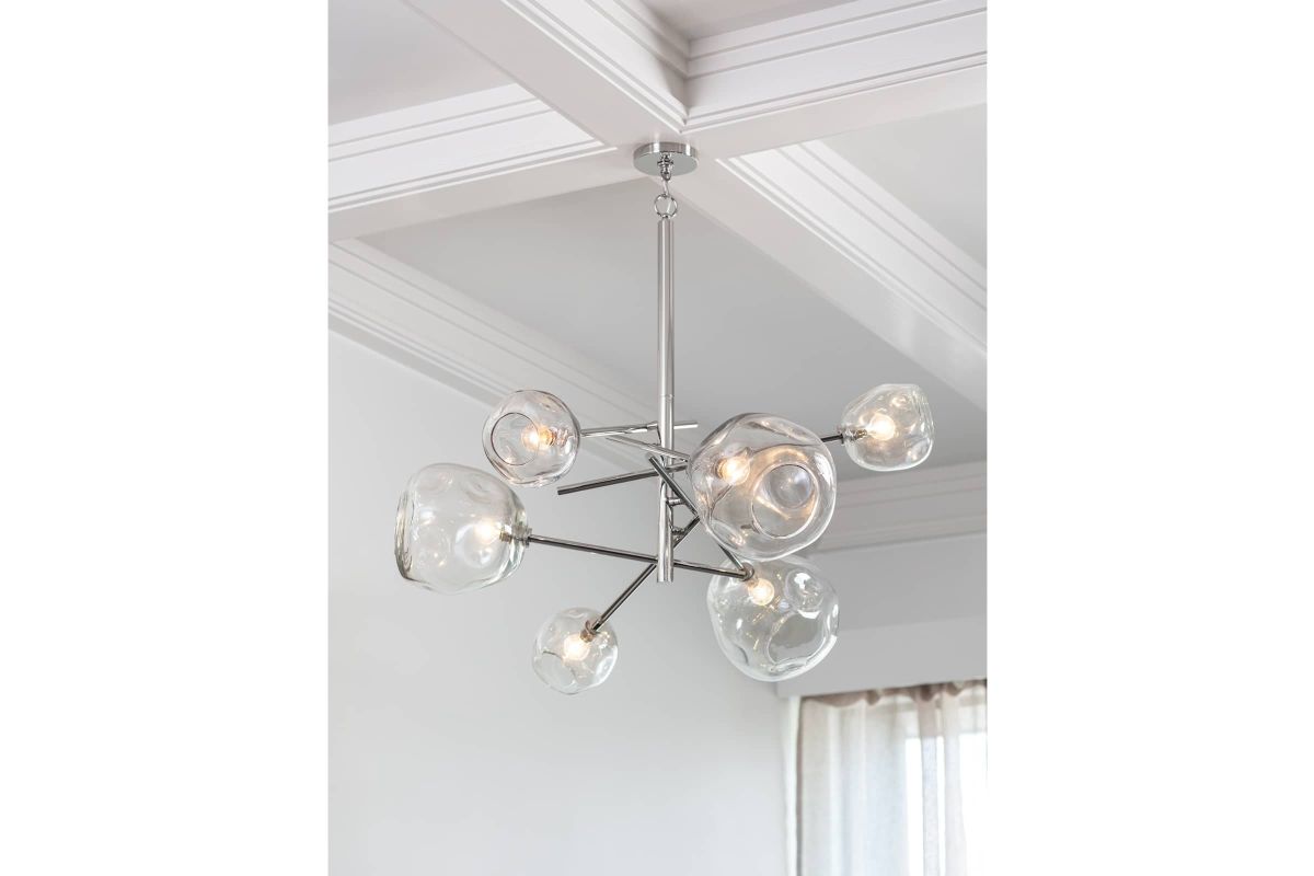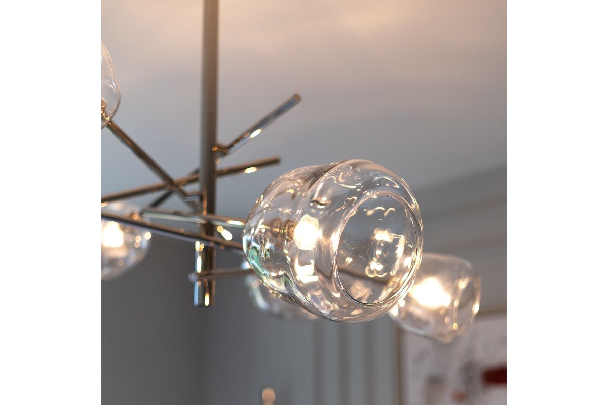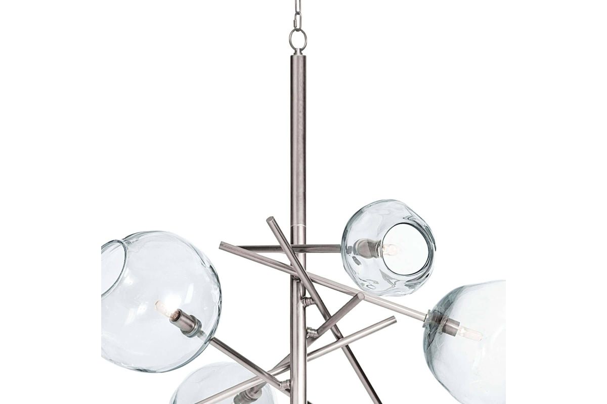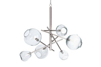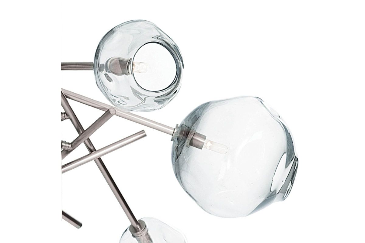 Molten glass has an inherent beauty because of its artisan-crafted, organic form. The natural glass shade variation creates dramatic light play and contrast, especially when combined with the modern appeal of its polished nickel, linear pipes. A true sculptural beauty, the Molten Chandelier is stunning on its own or in a pair, above a dining table, kitchen island, or anywhere else needing a little modern lighting drama. Assembly is required upon delivery.