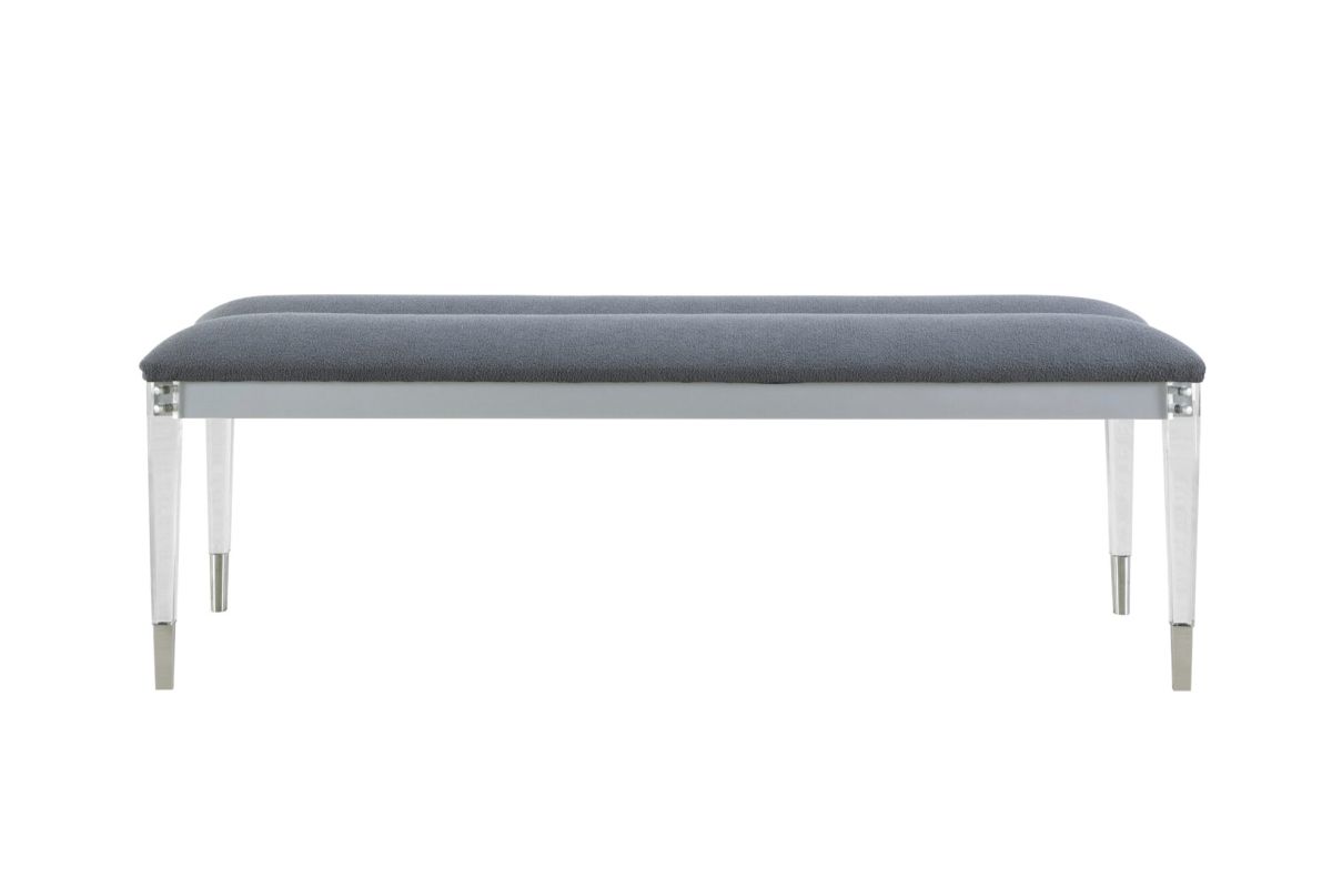 Enhance your bedroom with the contemporary elegance of the Lando Bench by Global Furniture USA. This stunning piece is finished in a sophisticated grey fabric and embellished with chic acrylic legs, offering a perfect blend of modern design and luxurious detailing. Assembly Required.