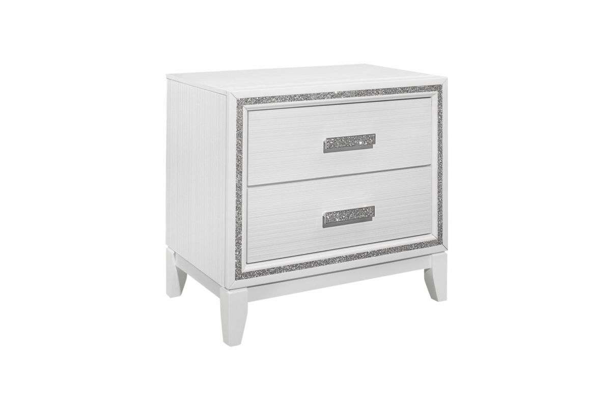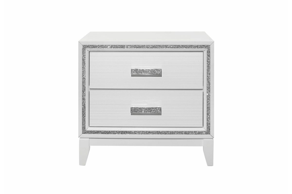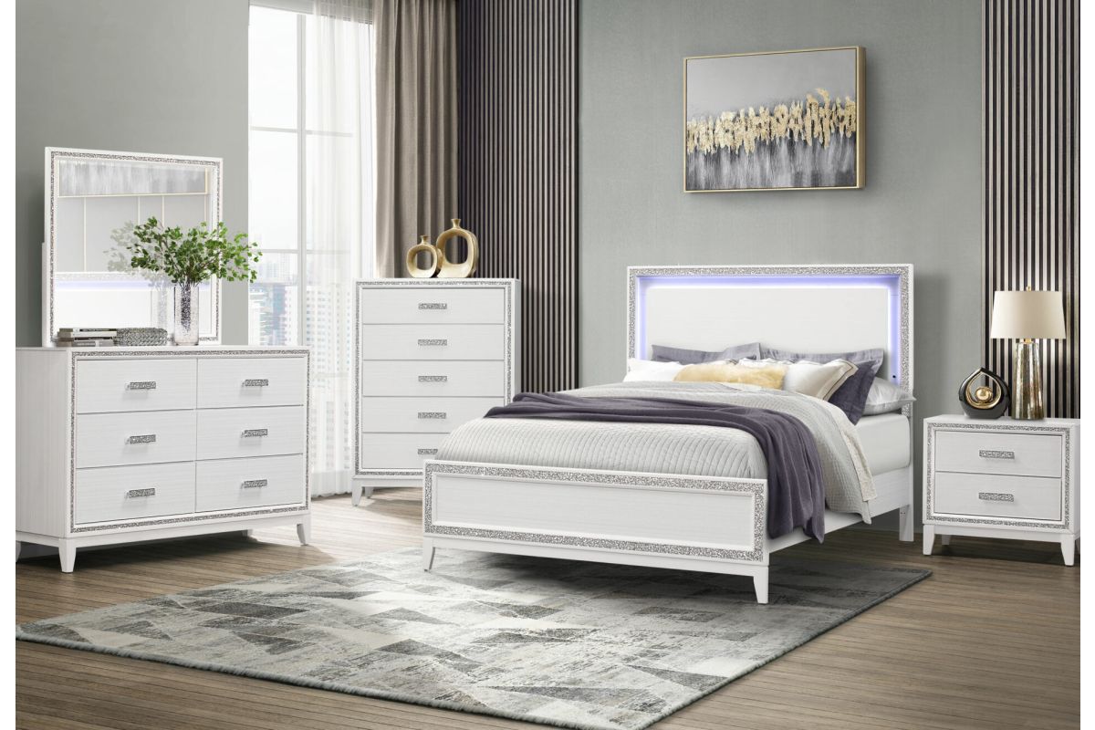 Lily bedroom brings two worlds together. The classic lines and modern accents create a beautiful transitional glam bedroom look. The crushed crystal like look outlines all the pieces along with LED lighting accenting the head board. The crushed crystal like design is not only used as an accent trim but is also carried over to the hardware. The end result is a beautiful glam bedroom. Assembly Required.