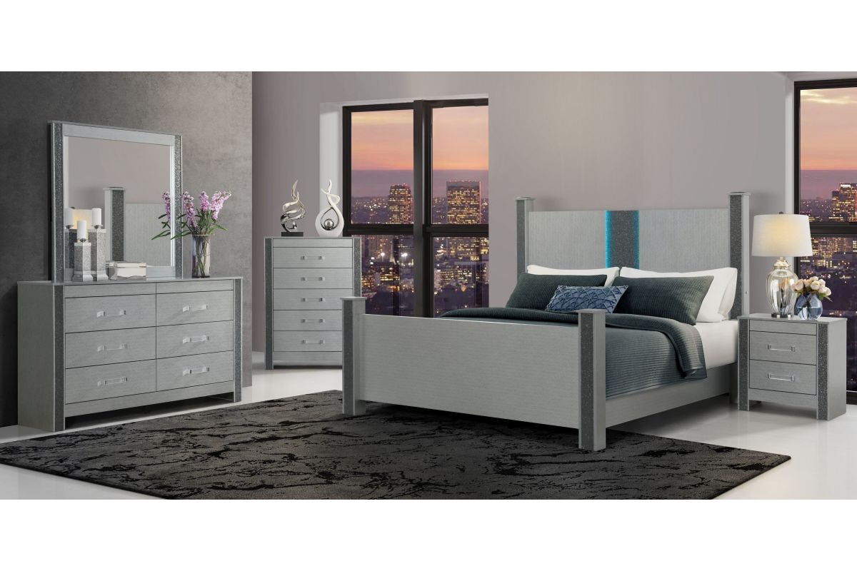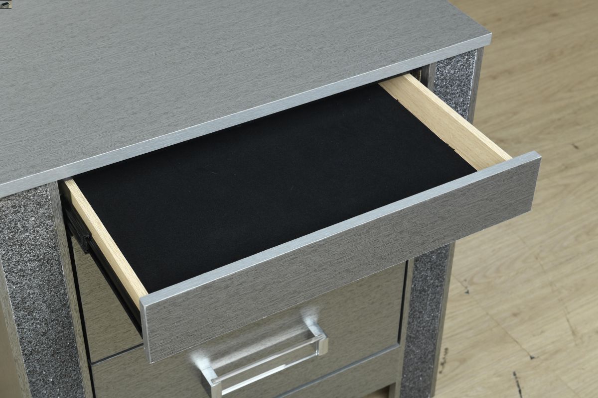 The Logan Nightstand is a stylish and functional addition to your bedroom. With its silver finish and crushed crystal accents, this nightstand offers convenient storage space while enhancing the room's elegance. It's the perfect companion piece to complete your Logan Bedroom Collection. Assembly Required.
