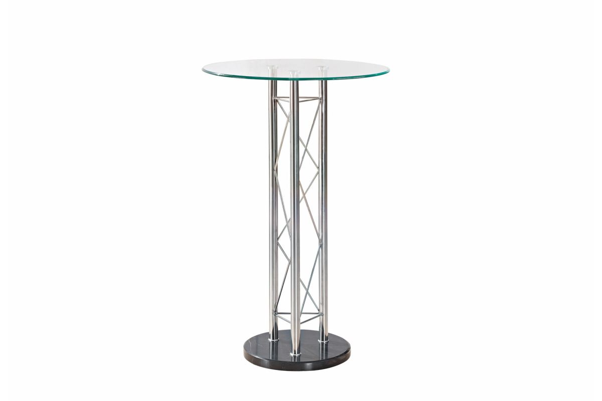 Enhance the trendy contemporary look of your casual dining area with this chrome metal circular bar table. Perfect for any space, this piece features straight tube legs with detail, glass top and a black finish on the base. Requires Assembly. Set Includes: