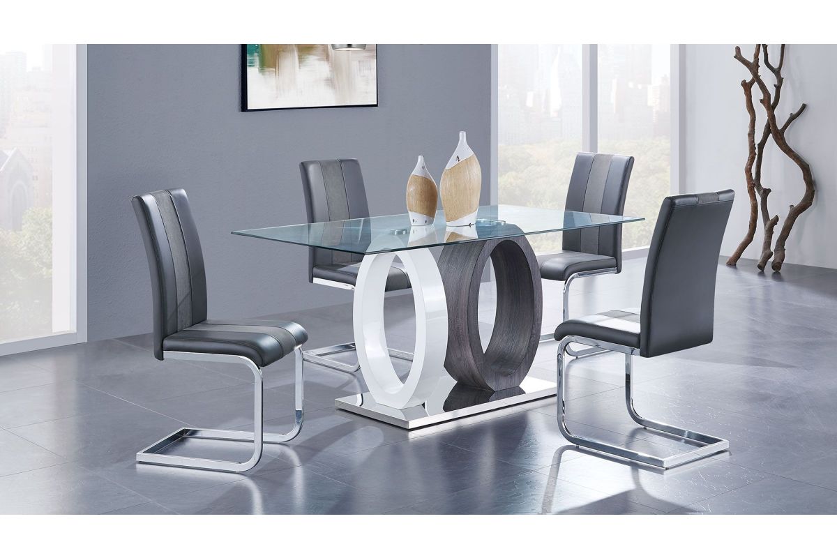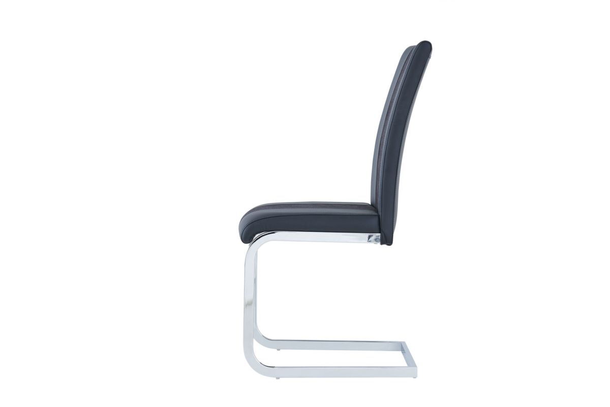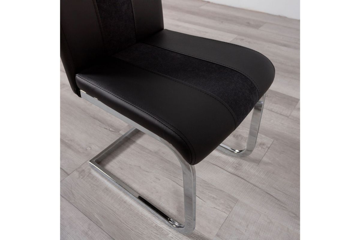 Perfect for your kitchen or breakfast nook, this two-toned dining chair will transform your room and add comfort and charm. This chair is upholstered in tones of black faux leather (PU) and fabric, providing an eye-catching and modern twist to traditional kitchen seating. Decorating possibilities are endless with the attractive tones of this chair. Additional design elements include a sleek style silver toned metal base and ample padding, continuing the delightful look and comfy feel of this seating. Quality craftsmanship in every facet of production ensures durability and long-lasting wear. For a stylish and modern take on kitchen or dining room furnishings, this chair is a can't miss choice in comfortable seating. Requires Assembly.
