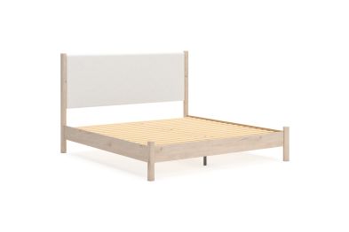 This king upholstered panel headboard is made with engineered wood (MDF/particleboard/plywood) and decorative laminate for the right balance of affordability and durability. Featuring decorative post legs and creamy white boucle polyester upholstery. Minor assembly required. Pairs with other items in the series to make a bed kit.