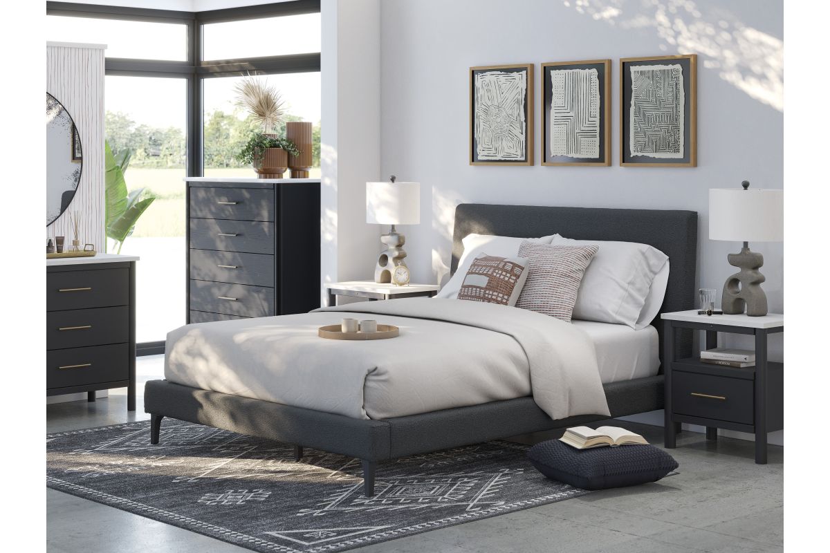 This queen upholstered bed reflects your sophisticated approach to boho style. Crafted with both form and function in mind, its black boucle fabric brings trend-right beauty to bedtime. The versatile design suits all-neutral spaces or blends with your favorite pops of color. It's inviting, yet posh. Luxe, yet laid-back. With this bed, your free-spirited vibe meets modern design.