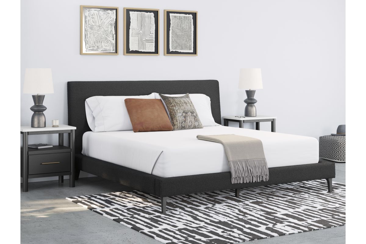 This king upholstered bed reflects your sophisticated approach to boho style. Crafted with both form and function in mind, its black boucle fabric brings trend-right beauty to bedtime. The versatile design suits all-neutral spaces or blends with your favorite pops of color. It�s inviting, yet posh. Luxe, yet laid-back. With this bed, your free-spirited vibe meets modern design.