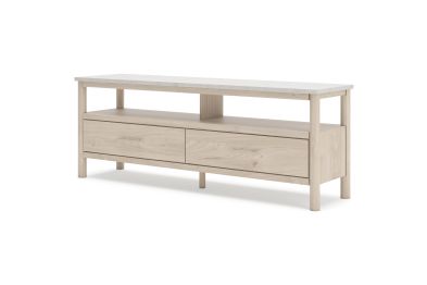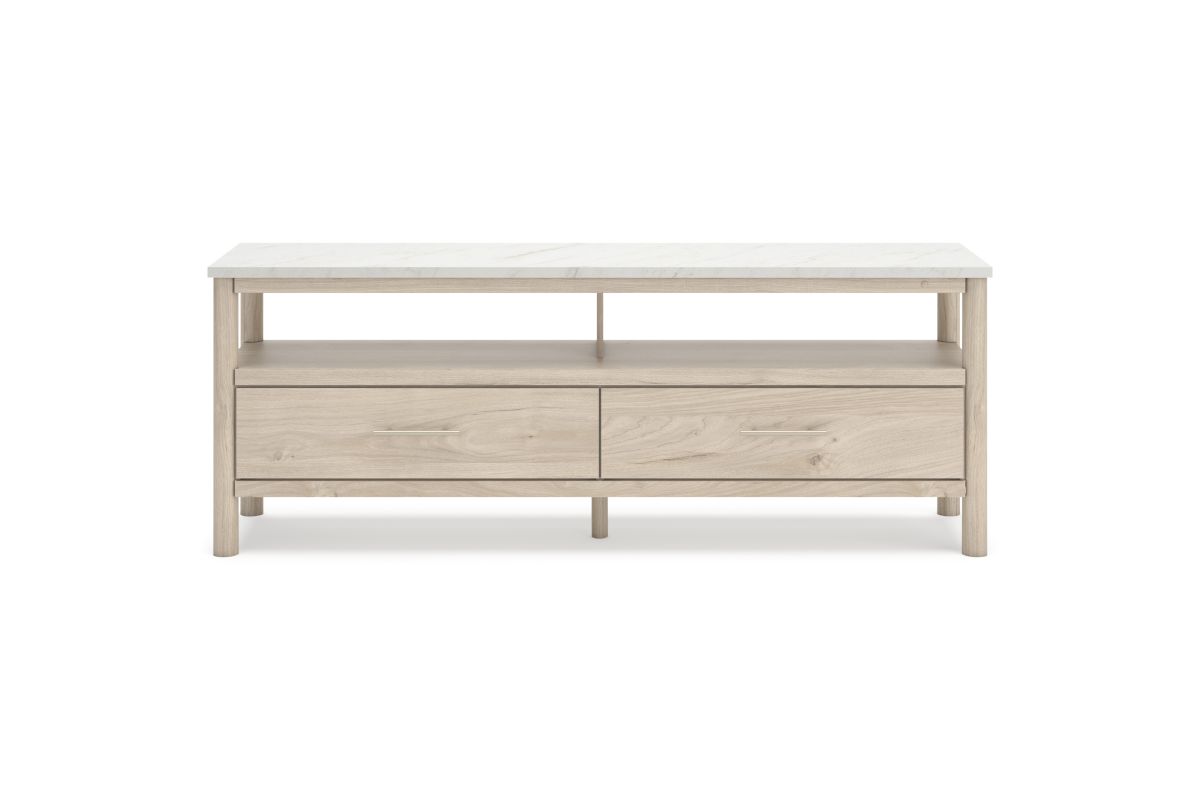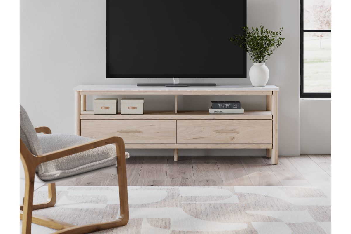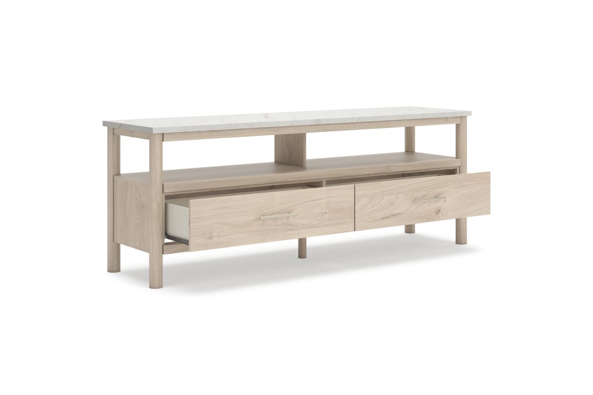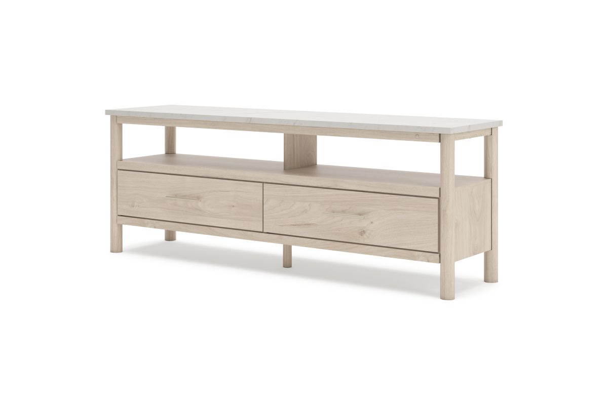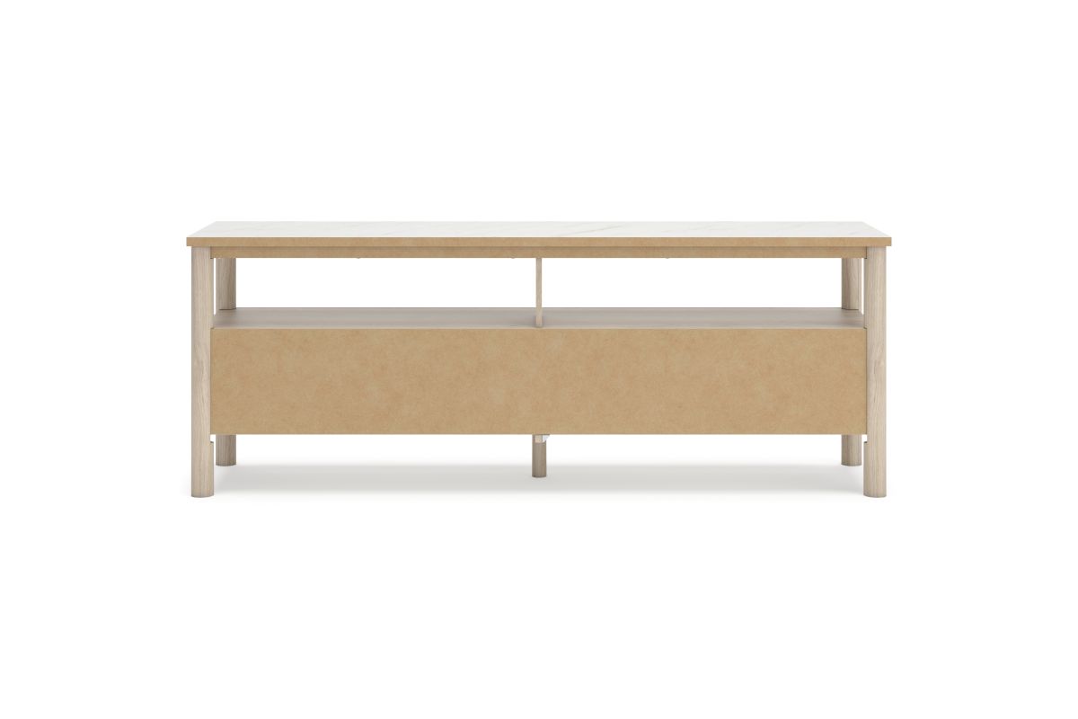 Imagine a TV stand that adds sophisticated and minimal boho style to your home with a stylish storage solution. This stand does just that. Its sleek design and replicated marble top create an upscale ambiance that's perfect for displaying your television and organizing your space. Assembly required.