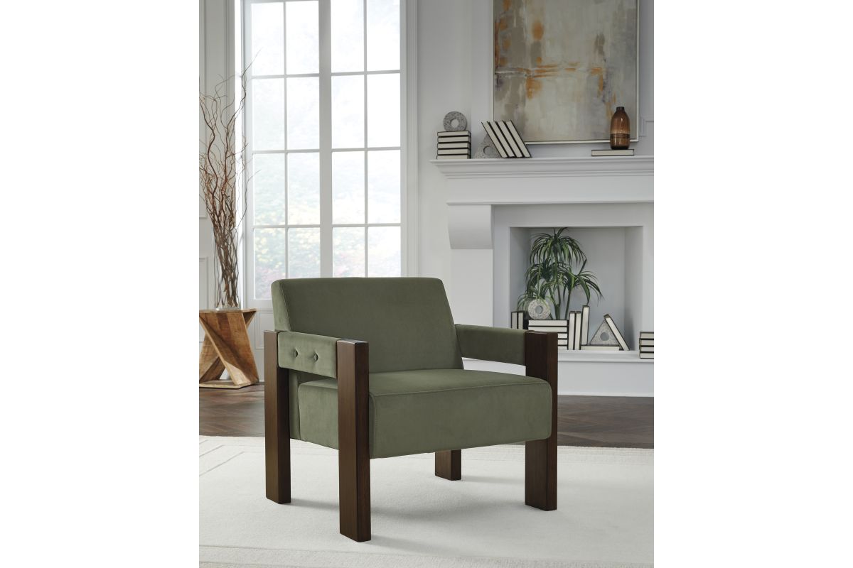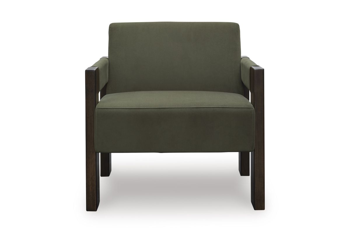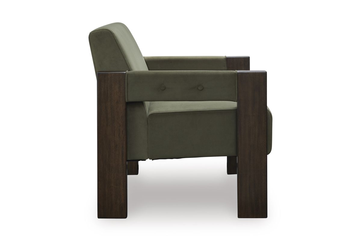 Get your modern sophistication on with this chic accent chair. Its rich olive green velvet upholstery is both luxurious and inviting, while an espresso-finished wood frame provides a warm, grounding element. The chair's clean lines and minimalist design make it a versatile piece that complements a variety of decor styles. Assembly Required.