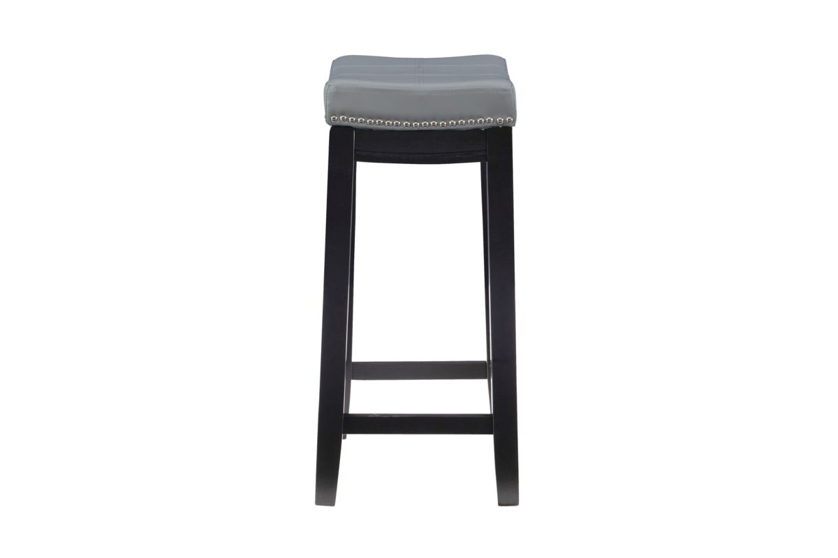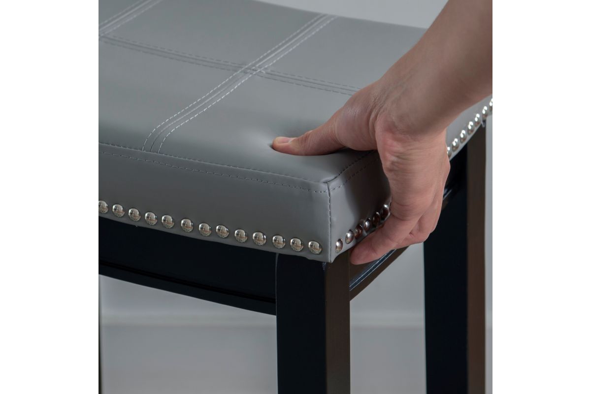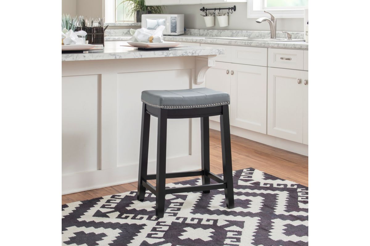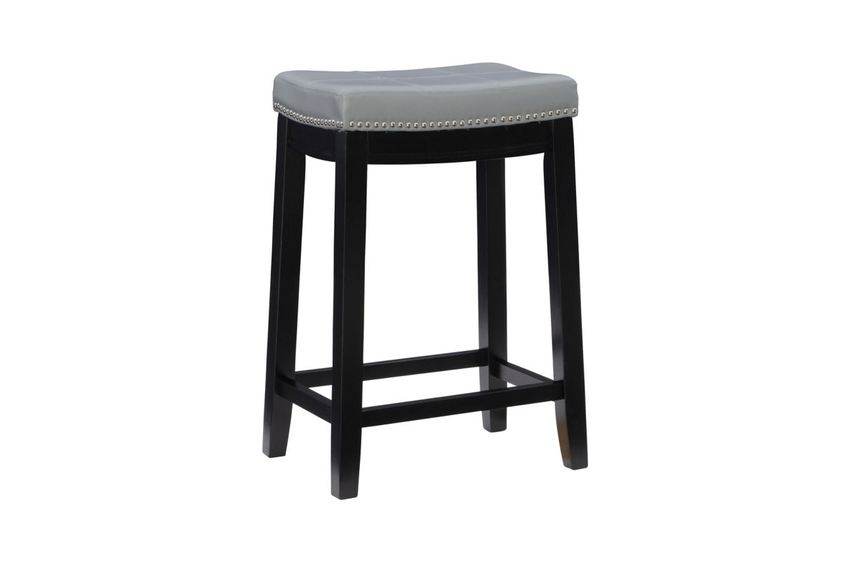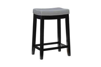 This gray counter stool will add stylish seating to any counter or high top table in your home. The sturdy wood frame has a black finish accented by a gray faux leather upholstered seat. Silver nail head trim and double needle stitching adds durability to the padded top for and eye catching detail. 26.5" Seat height. 275 Pound weight limit. Assembly required.