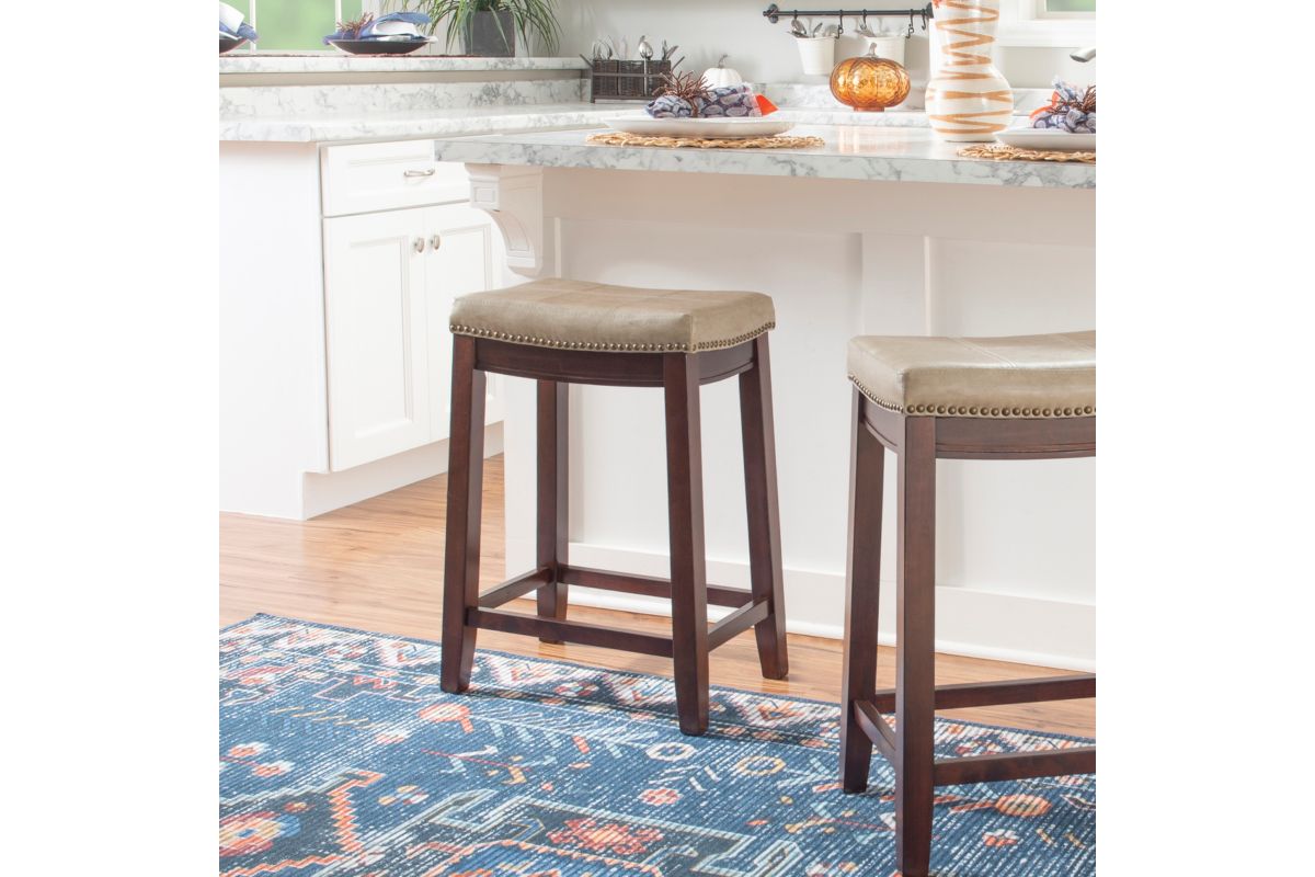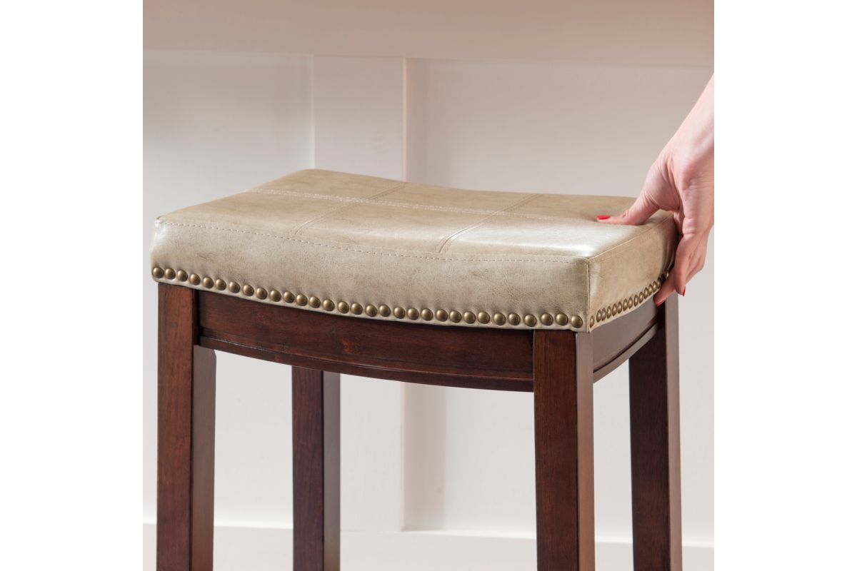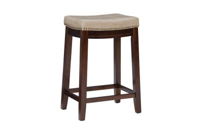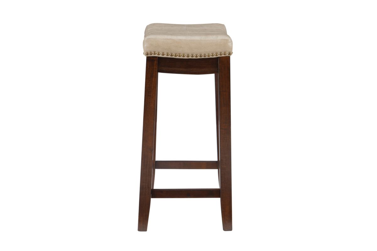 This beige counter stool will add stylish seating to any counter or high top table in your home. The sturdy wood frame has a dark brown finish accented by a beige faux leather upholstered seat. Antique brass nail head trim and double needle accent stitching adds durability to the padded top for an eye catching detail. 26.5" Seat height. 275 Pound weight limit. Assembly Required.