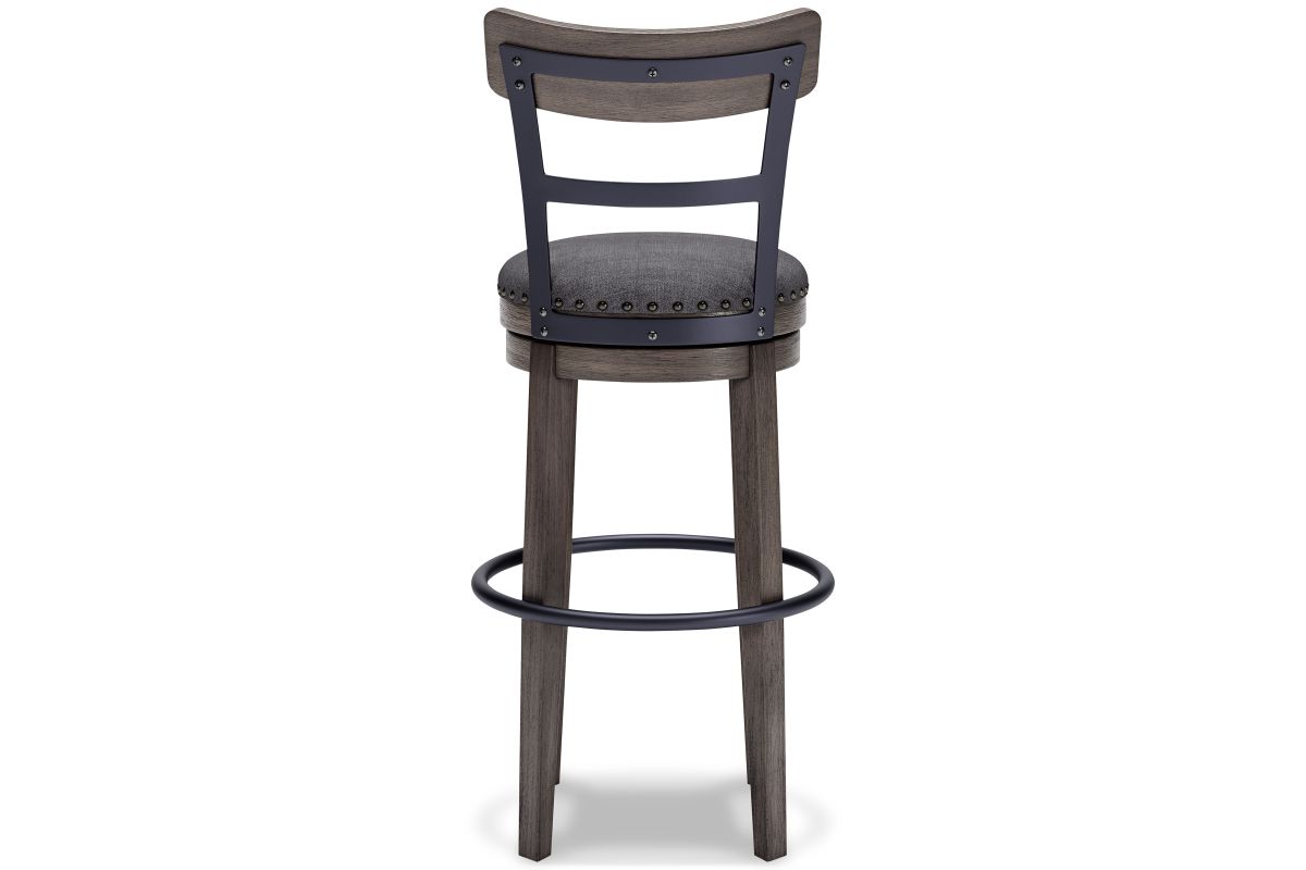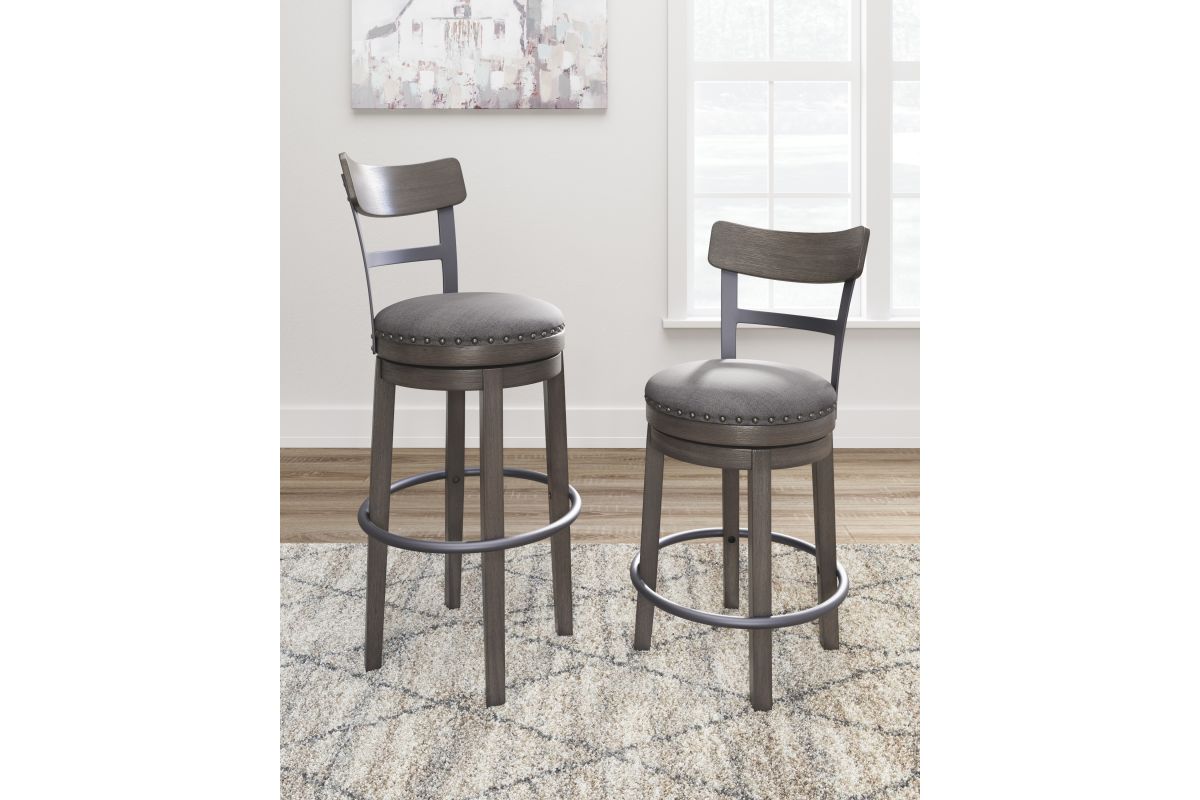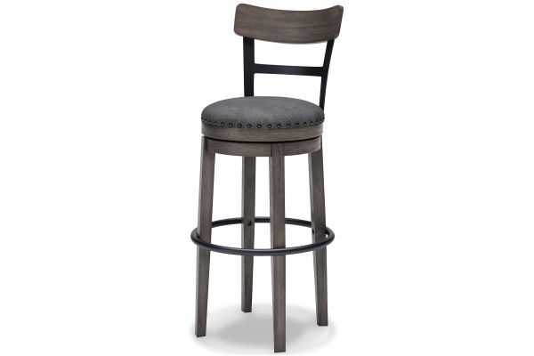 Bring a relaxed yet refined sense of good taste to a space with this upholstered swivel bar stool. The sturdy wood frame with contoured backrest is beautified with an antiqued gray wash finish that's easy on the eyes. Rest assured, this bar stool caters to your comfort with a cushioned seat with gray textured fabric accentuated with nailhead trim. Sensible swivel design keeps you in the flow of conversation. Assembly required.
