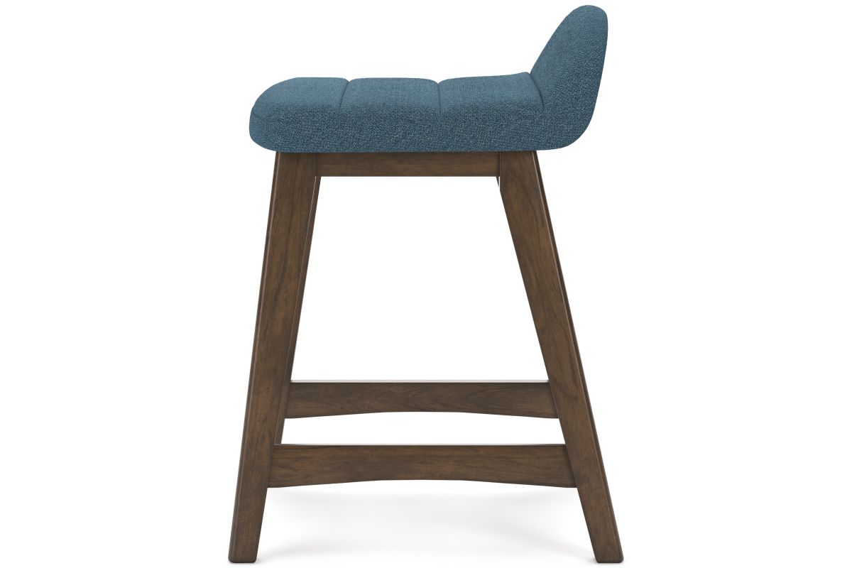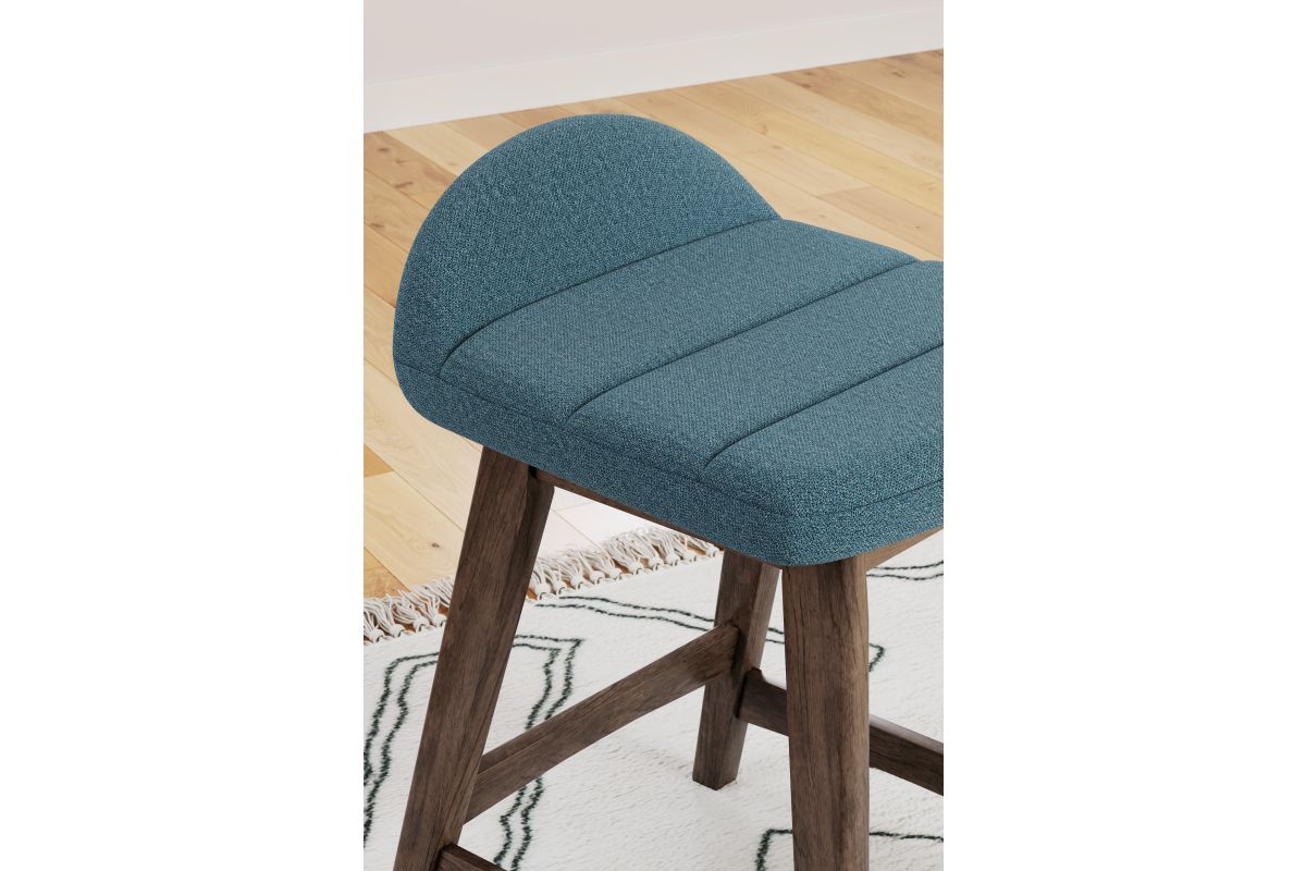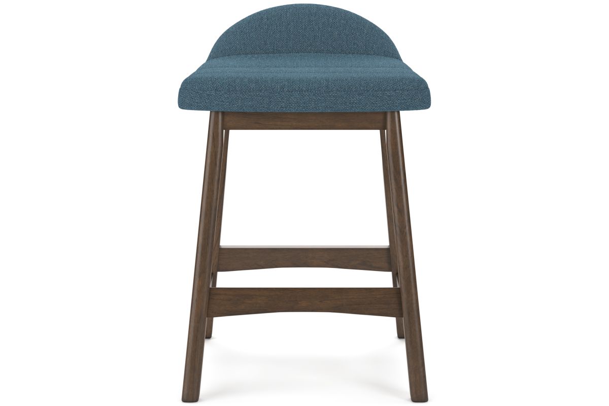 A refreshed take on retro aesthetics. This upholstered bar stool adds an air of playful simplicity to your dining space, capturing the architectural language of mid-century stylings. The seat invites the eye with a soft-edged silhouette and chic blue cushion. A casual, yet timeless, finish on the frame creates visual contrast to complete this study in form and function. Assembly required