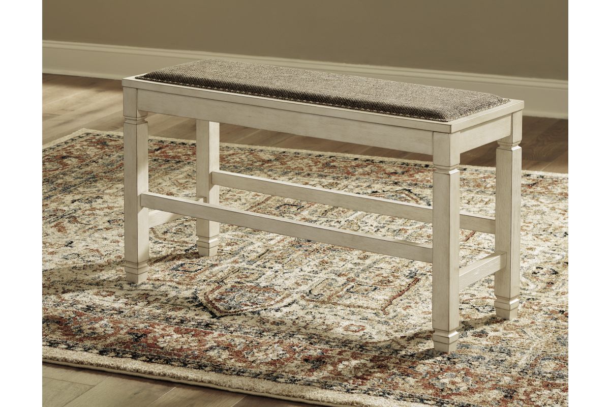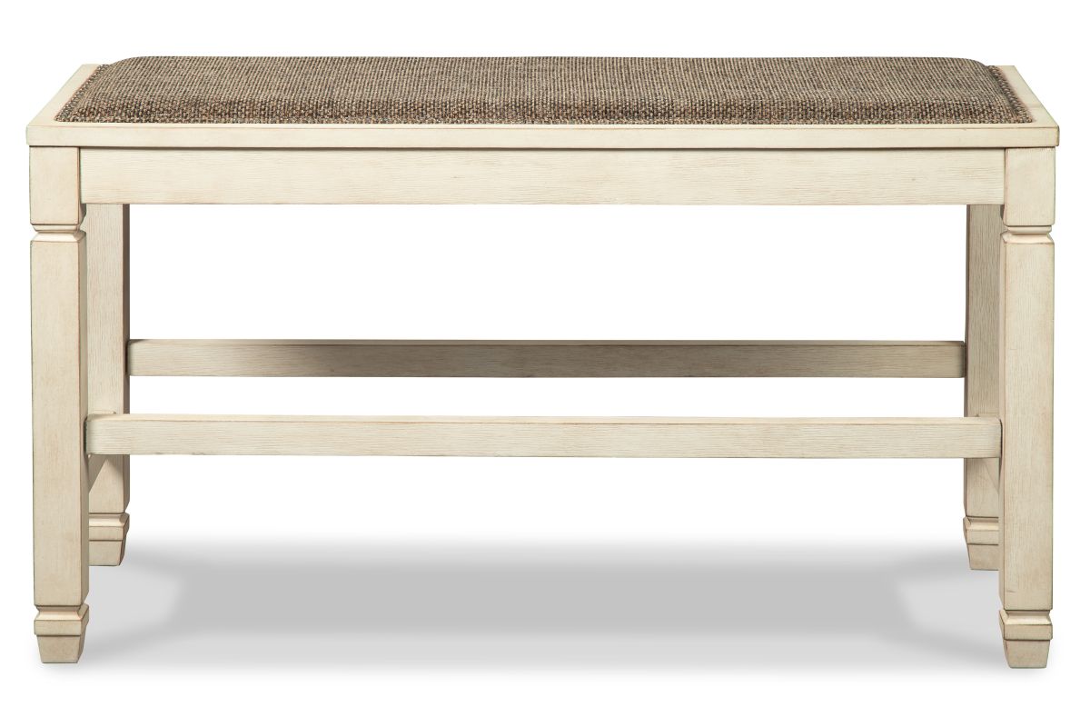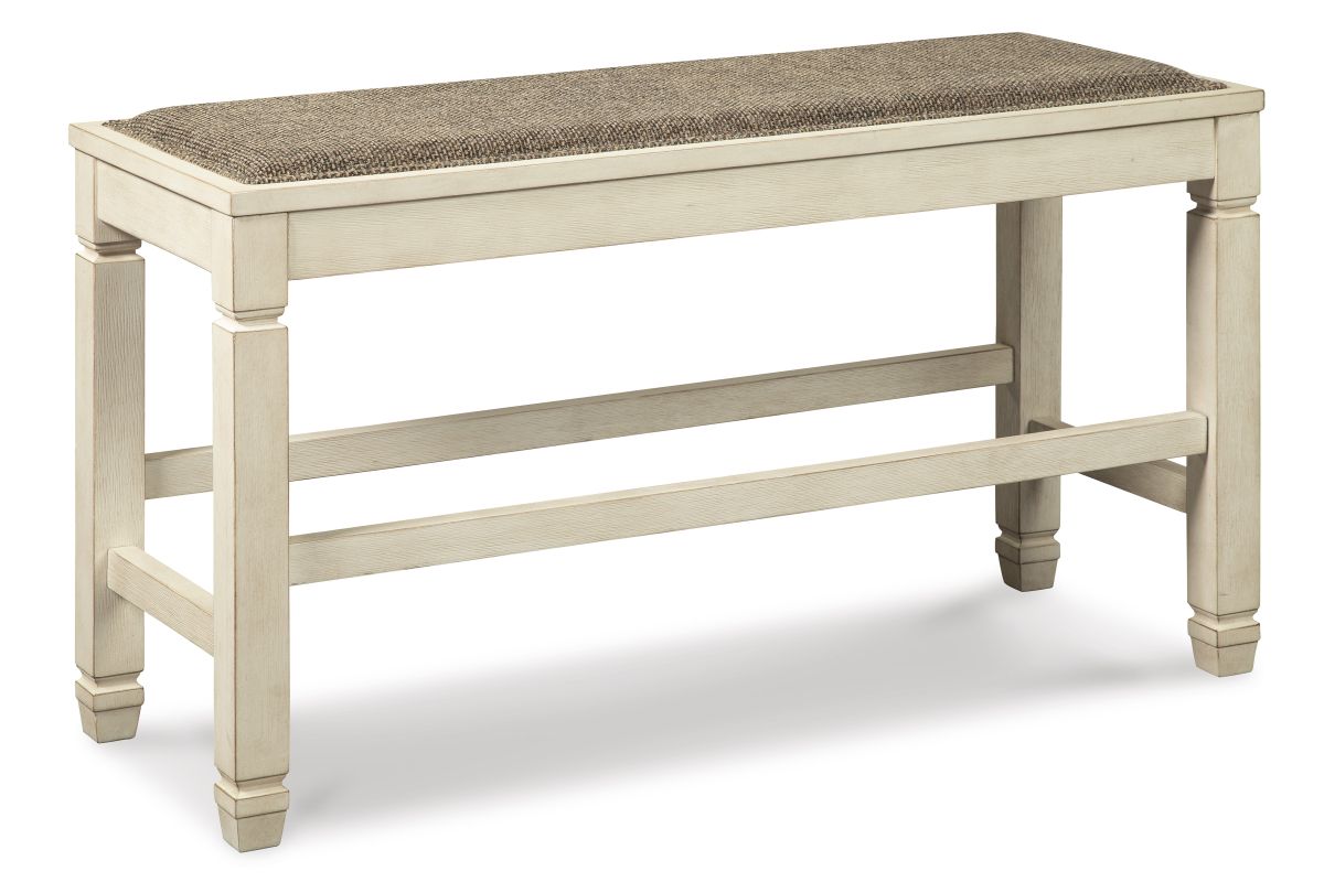 The beauty of this upholstered dining bench is something to savor. Serving up comfort and flair, this generously scaled counter-height bench entices with a cushioned seat covered in a heavy woven fabric that complements the antiqued white finish. Assembly required.