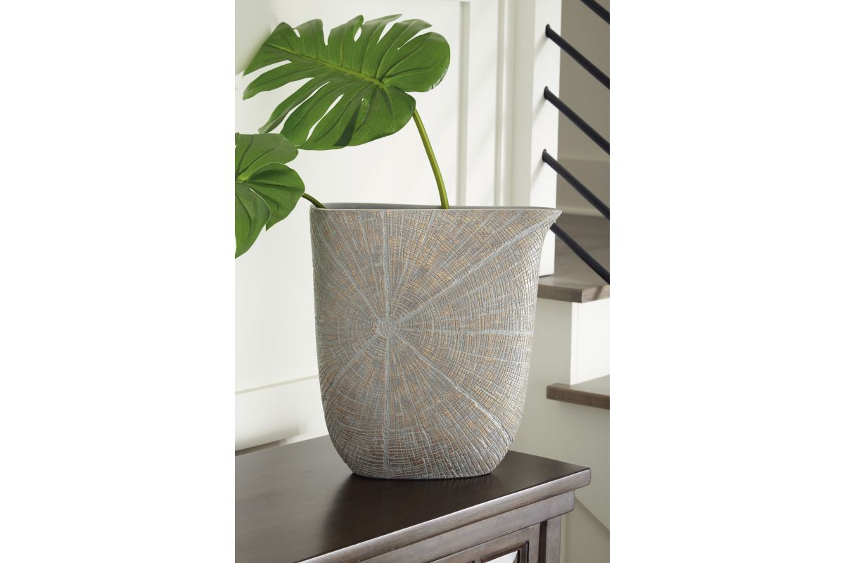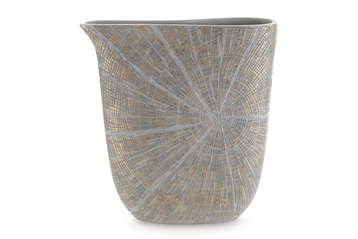 A unique mix of primitive and modern, this vase has an exquisite artisanal appeal. Its wide mouth holds your most bountiful bouquets. The vase's intriguing silhouette and starburst pattern capture the eye, complementing a room that craves sophistication.