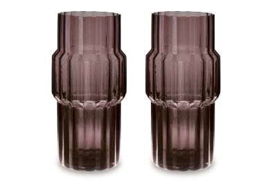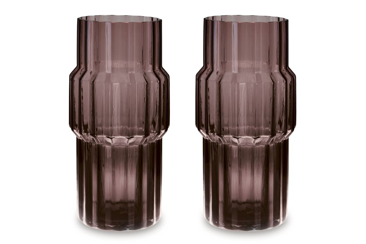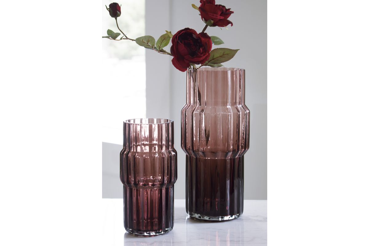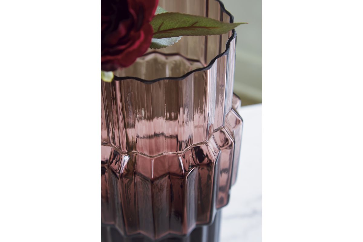 This vase, made of dark mauve-tinted glass, adds a captivating touch to indoor or outdoor decor. Its unique textured shape and oversized fluted details create an elegant art piece. Whether it's accentuating flowers or candlelight, this vase is simply striking from every angle.
