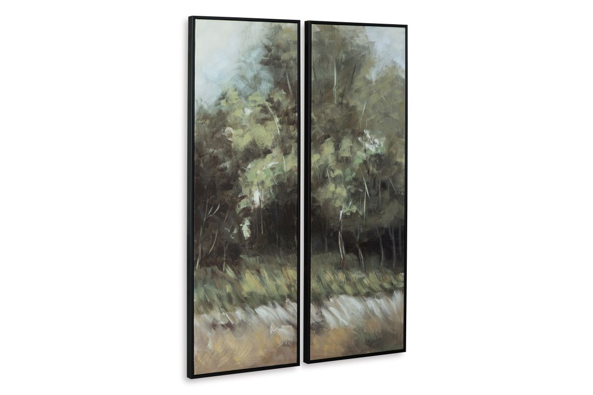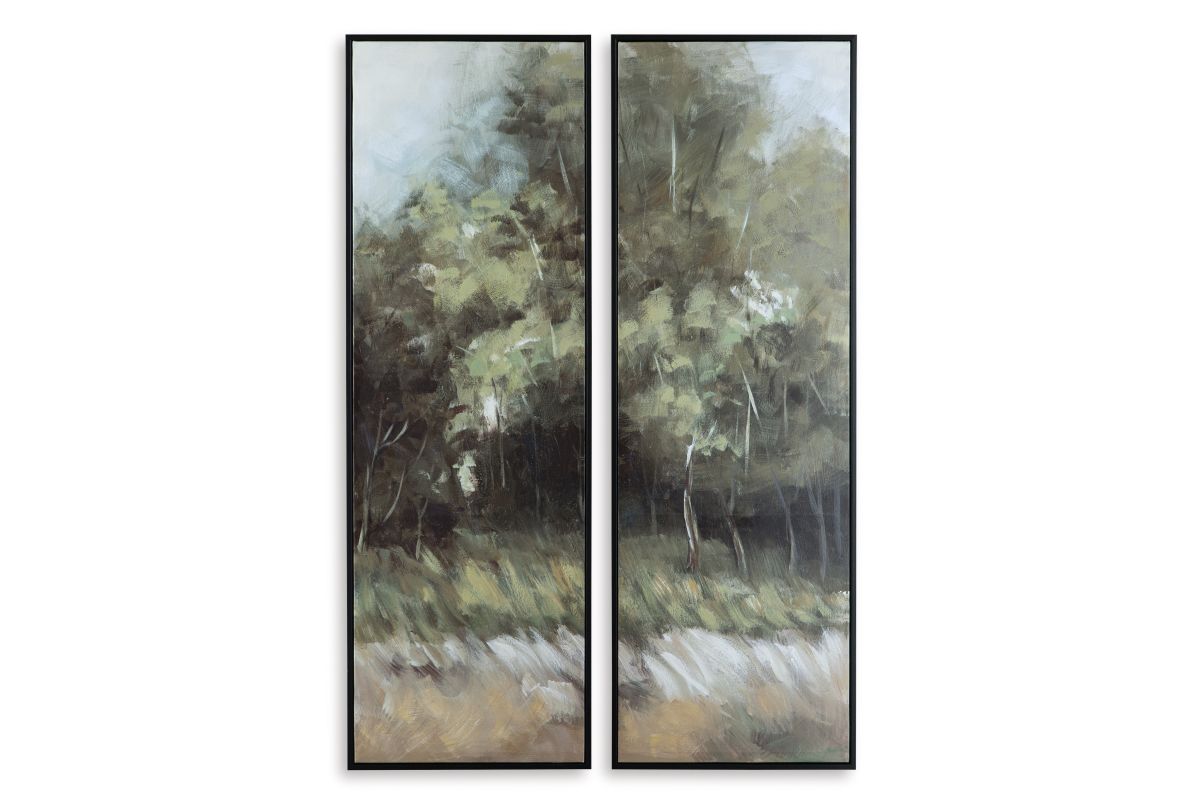 Double down on natural beauty with a stunning treescape. This wall art set brings the outdoors in, showcasing a whimsical wooded scene in green, brown, blue and white. Ideal for modern farmhouse or casual interiors, it grounds your decor with its intricate interpretation of nature.