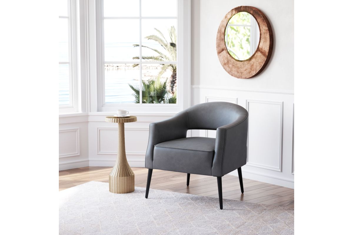 The Berkeley Accent Chair is covered with vinyl and sits on powder coated steel legs. This piece is the perfect boho chic, deco retro addition to any space, home, or hospitality. Assembly required.
