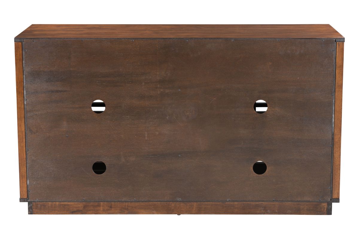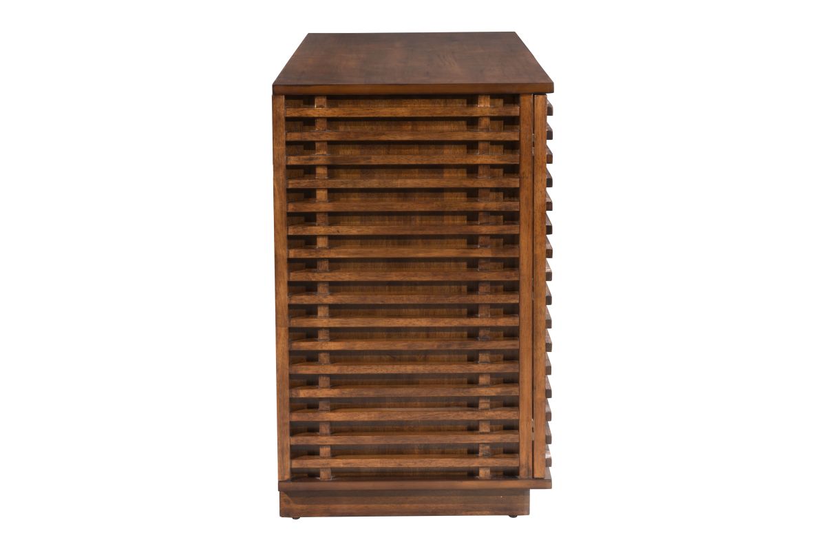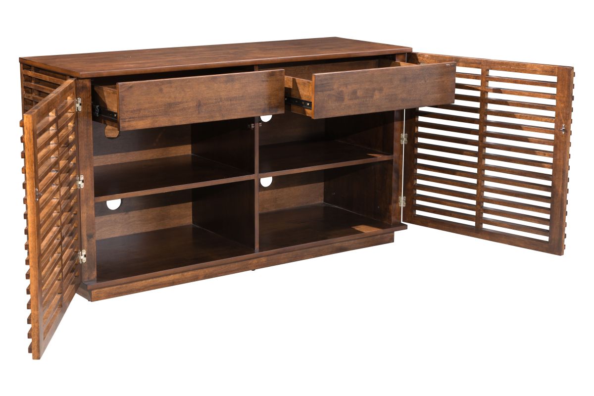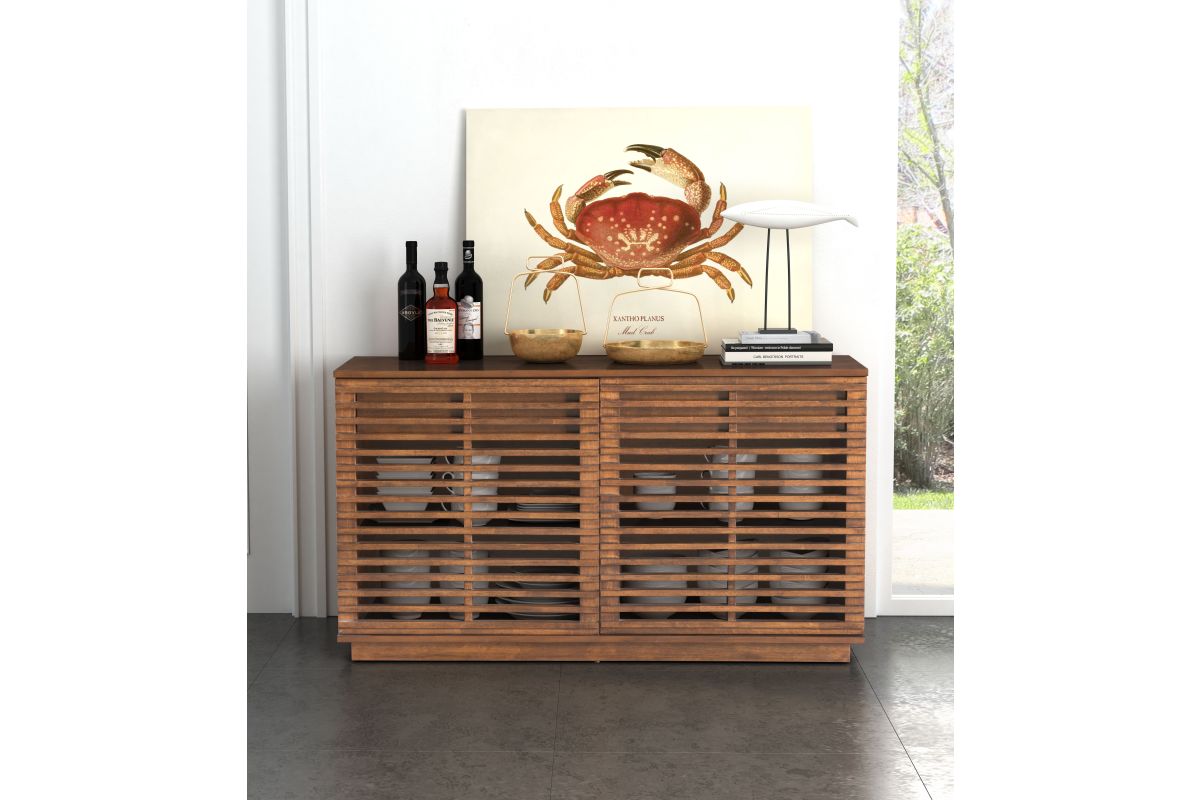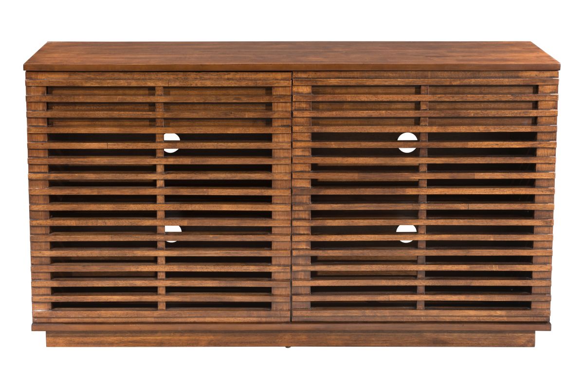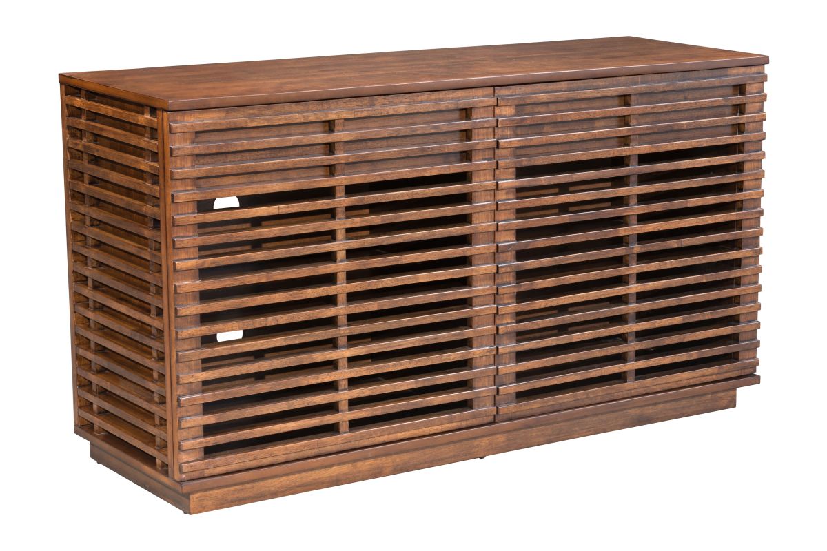 Scandinavian in design the Linea series features narrow slim strips of Solid Fir Wood, creating a Modern airy design finished in a rich walnut finish. The credenza features two front opening doors, two interior drawers with two adjustable shelves, and holes for TV components accessibility. Assembly required.